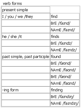 find [find finds found finding] verb, noun BrE [faɪnd] NAmE [faɪnd] verb (found, foundBrE [faʊnd] ; NAmE [faʊnd] ) BY CHANCE 1. transitive to discover sb/sth unexpectedly or by chance •~ sb/sth Look what I've found! • We've found a great new restaurant near the office. •~ sb/sth + adj. A whale was found washed up on the shore. BY SEARCHING 2. transitive to get back sth/sb that was lost after searching for it/them •~ sth for sb Can you find my bag for me? •~ sb sth Can you find me my bag? •~ sb/sth I wanted to talk to him but he was nowhere to be found. •~ sb/sth + adj. The child was found safe and well. BY STUDYING/THINKING 3. transitive to discover sth/sb by searching, studying or thinking carefully •~ sth/sb scientists trying to find a cure for cancer • I managed to find a solution to the problem. • I'm having trouble finding anything new to say on this subject. •Have they found anyone to replace her yet? •~ sth for sb Can you find a hotel for me? •~ sb sth Can you find me a hotel? BY EXPERIENCE/TESTING 4. transitive to discover that sth is true after you have tried it, tested it or experienced it •~ (that)… I find (that) it pays to be honest. • The report found that 30% of the firms studied had failed within a year. •~ sb/sth + adj./noun We found the beds very comfortable. •~ sb/sth to be/do sth They found him to be charming. •Her blood was found to contain poison. •it is found that… It was found that her blood contained poison. HAVE OPINION/FEELING 5. transitive to have a particular feeling or opinion about sth •~ sth + adj. You may find your illness hard to accept. • You may find it hard to accept your illness. •I find it amazing that they're still together. •~ sth + noun She finds it a strain to meet new people. HAVE/MAKE AVAILABLE 6. transitive ~ sth to have sth available so that you can use it •I keep meaning to write, but never seem to find (the) time. • How are we going to find £5 000 for a car? IN UNEXPECTED SITUATIONS 7. transitive to discover sb/sth/yourself doing sth or in a particular situation, especially when this is unexpected •~ sb/sth/yourself + adv./prep. She woke up and found herself in a hospital bed. •~ sb/sth/yourself + adj. We came home and found him asleep on the sofa. •~ sb/sth/yourself doing sth I suddenly found myself running down the street. •~ (that)… I was disappointed to find that they had left already. REACH 8. transitive ~ sth (of things)to arrive at sth naturally; to reach sth •Water will always find its own level. •Most of the money finds its way to the people who need it. •The criticism found its mark (= had the effect intended). EXIST/GROW 9. transitive ~ sth + adv./prep. used to say that sth exists, grows, etc. somewhere • These flowers are found only in Africa. • You'll find this style of architecture all over the town. IN COURT 10. transitive, intransitive (formal)to make a particular decision in a court case •~ sb + adj. The jury found him guilty. •How do you find the accused? •~ in sb's favour The court found in her favour. more at get/find/take your bearings at ↑bearing, find/meet your match at ↑match n., nowhere to be found/seen at ↑nowhere Verb forms: Word Origin: Old English findan, of Germanic origin; related to Dutch vinden and German finden. Thesaurus: find verb 1. T •Look what I've found! discover • • come across sb/sth • • stumble on/upon/across sb/sth • • catch • • turn sth up • • unearth • |formal come upon sb/sth • find/discover/come across/catch sb doing sth find/discover/unearth the remains (of sth) find/discover/stumble upon sth by accident 2. T •I can't find my keys. trace • • track sb/sth down • • search sb/sth out • • locate • |informal sniff sb/sth out • Opp: lose find/track down/search out/locate sth for sb/sth find/trace/track down/locate the missing… find/trace/track down the killer/location 3. T •Scientists are still trying to find a cure for cancer. discover • • identify • • establish • |formal determine • • ascertain • find/discover/identify/establish/determine/ascertain the cause find/discover/identify/establish a connection find/discover a cure/the answer 4. T •Her blood was found to contain poison. find (sth) out • • discover • • hear • • learn • find/find out/hear/discover/learn that… find/discover sb/sth to be/have, etc. sth be surprised/saddened/delighted/interested to find/discover/hear/learn sth 5. T •I find watching television so boring. consider • • think • • feel • • see • • view • • count • • regard • |especially BrE, informal reckon • find/consider/reckon sb/sth to be sth 6. T (not used in the progressive tenses) •These flowers are found only in Africa. exist • • live • • occur • |formal prevail • be found/exist/live/occur/prevail in/among sth still be found/exist/live/occur/prevail Synonyms: regard call • find • consider • see • view These words all mean to think about sb/sth in a particular way. regard • to think of sb/sth in a particular way: ▪ He seemed to regard the whole thing as a joke. call • to say that sb/sth has particular qualities or characteristics: ▪ I wouldn't call German an easy language. find • to have a particular feeling or opinion about sth: ▪ You may find your illness hard to accept. consider • to think of sb/sth in a particular way: ▪ Who do you consider (to be) responsible for the accident? regard or consider? These two words have the same meaning, but they are used in different patterns and structures. In this meaning consider must be used with a complement or clause: you can consider sb/sth to be sth or consider sb/sth as sth, although very often the to be or as is left out: ▪ He considers himself an expert. ◇ ▪ They are considered a high-risk group. You can also consider that sb/sth is sth and again, the that can be left out. Regard is u