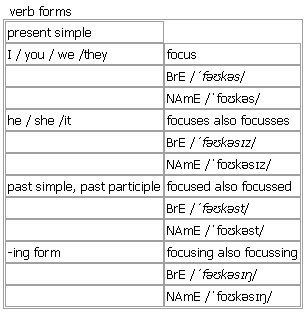 focus AW [focus focuses focusses focused focussed focusing focussing] verb, noun BrE [ˈfəʊkəs] NAmE [ˈfoʊkəs] verb (-s-or -ss-) 1. intransitive, transitive to give attention, effort, etc. to one particular subject, situation or person rather than another •~ (on/upon sb/sth) The discussion focused on three main problems. • Each exercise focuses on a different grammar point. •~ sth (on/upon sb/sth) The visit helped to focus world attention on the plight of the refugees. 2. intransitive, transitive (of your eyes, a camera, etc.)to adapt or be adjusted so that things can be seen clearly; to adjust sth so that you can see things clearly • It took a few moments for her eyes to focus in the dark. •~ on sb/sth Let your eyes focus on objects that are further away from you. •In this scene, the camera focuses on the actor's face. •~ sth (on sb/sth) He focused his blue eyes on her. •I quickly focused the camera on the children. 3. transitive ~ sth (on sth) (technical)to aim light onto a particular point using a ↑lens Verb forms: Word Origin: mid 17th cent. (as a term in geometry and physics): from Latin, literally domestic hearth. Thesaurus: focus verb 1. I, T •The discussion focused on two main issues. target • • direct • • turn • • be aimed at sb • • orient • |formal address • focus/target/turn sth on sth efforts/resources/campaigns are focused on/targeted at/directed at sb/sth attention is focused on/directed at/turned to sb/sth 2. I, T •Focus the camera on the children. point • • aim • • direct • • turn • focus/turn sth on sb/sth point/aim/direct sth at sb/sth focus/point/aim a camera focus/aim/direct (a) light Example Bank: •Degree courses have traditionally focused on the established great writers of the past. •He inevitably focused on his own concerns, with only a passing query about Jeff. •She blinked and tried to focus. •The attention of the news media was firmly focused on the elections. •The department undertakes highly focused research. •The eye will automatically focus on the small group in the foreground. •The study focuses exclusively on schools. •The study was criticized for being too narrowly focused. •Think of some questions that will help focus the discussion. •We need to focus upon the main issues. •At the moment, aid agencies are focusing their efforts on women and children. •I was finding it hard to focus my mind properly. •In this scene, the camera focuses on the actor's face. •Much recent concern has been focused upon sea level rises. •Our activity is mainly focused on responding to emergencies. •Schools should not focus exclusively on exam results. •She used her glasses to focus the sun's rays on the twigs and spark a fire. •The discussion focused on three main issues. •This provides an opportunity to focus research on the health needs of the population. •Where do you really wish to focus your time and energy? •You need to focus closely on the matter at hand. noun (pl. fo·cusesor fociBrE [ˈfəʊsaɪ] ; NAmE [ˈfoʊsaɪ] ) 1. uncountable, countable, usually singular the thing or person that people are most interested in; the act of paying special attention to sth and making people interested in it • It was the main focus of attention at the meeting. •~ for sth His comments provided a focus for debate. •~ on sth We shall maintain our focus on the needs of the customer. •In today's lecture the focus will be on tax structures within the European Union. •The incident brought the problem of violence in schools into sharp focus. •What we need now is a change of focus (= to look at things in a different way). 2. uncountable a point or distance at which the outline of an object is clearly seen by the eye or through a ↑lens • The children's faces are badly out of focus (= not clearly shown) in the photograph. • The binoculars were not in focus (= were not showing things clearly). 3. (also ˈfocal point)countable (physics)a point at which waves of light, sound, etc. meet after ↑reflection or ↑refraction; the point from which waves of light, sound, etc. seem to come 4. countable (geology)the point at which an ↑earthquake starts to happen Word Origin: mid 17th cent. (as a term in geometry and physics): from Latin, literally domestic hearth. Thesaurus: focus noun U, C, usually sing. •His comments provided a focus for debate. focal point • • hub • • heart • |BrE centre • |AmE center • an important focus/focal point/hub act/serve as a focus/focal point/centre give sth/provide a focus/focal point Example Bank: •Cities have always acted as the principal focus of political life. •He found he was now their main focus of attention. •I found the focus of the debate too narrow. •I've directed my focus towards/toward developing my skills. •Our primary focus this term will be on group work. •She became a focus for all his anger. •The binoculars were not in focus. •The children's faces are badly out of focus in the photograph. •The company's restructuring is designed to give a sharper focus on key growth markets. •The focus has now shifted towards the problem of long-term unemployment. •The legal team tried to shift the focus onto the victim. •The media focus has now shifted onto something else. •The problem with your plan is that it doesn't have a clear focus. •The question of compensation comes into focus. •The restructuring is designed to give a sharper focus on key markets. •This case has brought the problem of drug abuse in schools into sharp focus. •When I got glasses suddenly the whole world came into focus. •an increased focus on younger people •soft focus shots of cuddly animals •the focus of my research •In today's lecture the focus will be on tax structures within the European Union. •What we need now is a change of focus. See also: ↑focal point