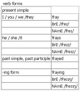 fray [fray frays frayed fraying] verb, noun BrE [freɪ] NAmE [freɪ] verb 1. intransitive, transitive if cloth frays or sth frays it, the threads in it start to come apart •The cuffs of his shirt were fraying. •This material frays easily. •~ sth It was fashionable to fray the bottoms of your jeans. 2. intransitive, transitive ~ (sth) if sb's nerves or ↑temper frays or sth frays them, the person starts to get irritated or annoyed •As the debate went on, tempers began to fray. Verb forms: Word Origin: v. late Middle English Old French freiier Latin fricare ‘to rub’ n. late Middle English fray ‘to quarrel’ affray ‘startle’ Anglo-Norman French afrayer ‘disturb, startle’ Germanic Old English frithu ‘peace, safety’ Idiom: ↑fray at the edges Derived Word: ↑frayed noun the fraysingular a fight, a competition or an argument, especially one that is exciting or seen as a test of your ability •They were ready for the fray. •to enter/join the fray •At 71, he has now retired from the political fray. Word Origin: v. late Middle English Old French freiier Latin fricare ‘to rub’ n. late Middle English fray ‘to quarrel’ affray ‘startle’ Anglo-Norman French afrayer ‘disturb, startle’ Germanic Old English frithu ‘peace, safety’