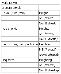 freight [freight freights freighted freighting] noun, verb BrE [freɪt] NAmE [freɪt] noun uncountable goods that are transported by ships, planes, trains or lorries/trucks; the system of transporting goods in this way •to send goods by air freight •a freight business •passenger and freight transportation services Word Origin: late Middle English (in the sense ‘hire of a ship for transporting goods’): from Middle Dutch, Middle Low German vrecht, variant of vracht ‘ship's cargo’. Compare with ↑fraught. Example Bank: •All vehicles carrying freight need a special permit. •The freight was transferred to a train at Rotterdam. •The train's freight wagons can carry a fully-laden lorry. •an agent handling freight and passengers •A freight train pulled into the station. •Local freight charges can be extremely high. •She runs a freight business in southern Germany. •The new road will be open to freight traffic only. •The total amount of freight transported on roads has risen by 150% in the past decade. •The trains were designed specifically to haul freight. •Their ships carry freight between Dunkirk and Dover. •We tend to use air freight for lighter goods. verb 1. ~ sth to send or carry goods by air, sea or train 2. usually passive ~ sth with sth (literary)to fill sth with a particular mood or tone •Each word was freighted with anger. Verb forms: Word Origin: late Middle English (in the sense ‘hire of a ship for transporting goods’): from Middle Dutch, Middle Low German vrecht, variant of vracht ‘ship's cargo’. Compare with ↑fraught.