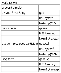 gas [gas gases gassed gassing] noun, verb BrE [ɡæs] NAmE [ɡæs]