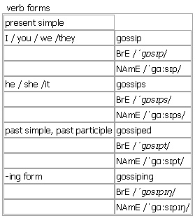 gos·sip [gossip gossips gossiped gossiping] noun, verb BrE [ˈɡɒsɪp] NAmE [ˈɡɑːsɪp] noun 1. uncountable (disapproving)informal talk or stories about other people's private lives, that may be unkind or not true •Don't believe all the gossip you hear. •Tell me all the latest gossip! •The gossip was that he had lost a fortune on the stock exchange. •It was common gossip (= everyone said so) that they were having an affair. •She's a great one for idle gossip (= she enjoys spreading stories about other people that are probably not true). 2. countable, usually singular a conversation about other people and their private lives •I love a good gossip. 3. countable (disapproving)a person who enjoys talking about other people's private lives Word Origin: late Old English godsibb, ‘godfather, godmother, baptismal sponsor’, literally ‘a person related to one in God’, from god ‘God’ + sibb ‘a relative’ (see ↑sib). In Middle English the sense was ‘a close friend, a person with whom one gossips’, hence ‘a person who gossips’, later (early 19th cent.) ‘idle talk’ (from the verb, which dates from the early 17th cent.). Synonyms: discussion conversation • dialogue • talk • debate • consultation • chat • gossip These are all words for an occasion when people talk about sth. discussion • a detailed conversation about sth that is considered to be important: ▪ Discussions are still taking place between the two leaders. conversation • a talk, usually a private or informal one, involving two people or a small group; the activity of talking in this way: ▪ a telephone conversation dialogue • conversations in a book, play or film: ▪ The novel has long descriptions and not much dialogue. A dialogue is also a formal discussion between two groups, especially when they are trying to solve a problem or end a dispute: ▪ The President told waiting reporters there had been a constructive dialogue. talk • a conversation or discussion, often one about a problem or sth important for the people involved: ▪ I had a long talk with my boss about my career prospects. debate • a formal discussion of an issue at a public meeting or in a parliament. In a debate two or more speakers express opposing views and then there is often a vote on the issue: ▪ a debate on prison reform consultation • a formal discussion between groups of people before a decision is made about sth: ▪ There have been extensive consultations between the two countries. chat • a friendly informal conversation; informal talking. The countable use of chat is especially British English: ▪ I just called in for a chat about the kids. gossip • a conversation about other people and their private lives: ▪ We had a good gossip about the boss. a discussion/conversation/dialogue/talk/debate/consultation/chat/gossip about sth a discussion/conversation/dialogue/debate/consultation on sth in (close) discussion/conversation/dialogue/debate/consultation with sb to have a discussion/conversation/dialogue/talk/debate/consultation/chat/gossip with sb to hold a discussion/conversation/debate/consultation Synonyms: speaker communicator • gossip • talker These are all words for a person who talks or who is talking, especially in a particular way. speaker • a person who is or was speaking; a person who speaks a particular language: ▪ I looked around to see who the speaker was. ◇ ▪ a fluent Arabic speaker communicator • (rather formal) a person who is able to describe their ideas and feelings clearly to others: ▪ The ideal candidate will be an effective communicator. gossip • (disapproving) a person who enjoys talking about other people's private lives: ▪ Myra is a dear, but she's also a terrible gossip. talker • a person who talks in a particular way or who talks a lot: ▪ He's a very persuasive talker. ◇ ▪ She's a (great) talker ▪ (= she talks a lot) ▪. speaker or talker? Talker is used when you are talking about how much sb talks or how well they talk. It is not used for the person who is or was talking: I looked round to see who the talker was. You can say that sb is a good/persuasive speaker but that means that they are good at making speeches. If you mean that they speak well in conversation, use talker. a good/great speaker/communicator/talker an effective/excellent speaker/communicator Example Bank: •A piece of silly gossip was going round the school. •He knows all the juicy gossip. •I heard an interesting bit of gossip yesterday. •I saw it in the gossip column of the local newspaper. •It's common gossip in the office that she's about to leave her husband. •She's having a gossip with Maria. •Someone has been spreading malicious gossip about me. •We had a good gossip about the boss. •You shouldn't listen to idle gossip. •a magazine full of gossip about famous people •I was having a gossip with Maggie when he arrived. •It was common gossip that they were having an affair. •Myra is a dear, but she's also a terrible gossip. •She's a great one for idle gossip. •Tell me all the latest gossip! •office gossip Derived Word: ↑gossipy verb intransitive to talk about other people's private lives, often in an unkind way •I can't stand here gossiping all day. •~ about sb/sth She's been gossiping about you. Verb forms: Word Origin: late Old English godsibb, ‘godfather, godmother, baptismal sponsor’, literally ‘a person related to one in God’, from god ‘God’ + sibb ‘a relative’ (see ↑sib). In Middle English the sense was ‘a close friend, a person with whom one gossips’, hence ‘a person who gossips’, later (early 19th cent.) ‘idle talk’ (from the verb, which dates from the early 17th cent.). Example Bank: •I can't stand here gossiping all day. •She's been gossiping about you.