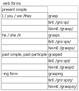 grasp [grasp grasps grasped grasping] verb, noun BrE [ɡrɑːsp] NAmE [ɡræsp] verb 1. ~ sb/sth to take a firm hold of sb/sth Syn: ↑grip •He grasped my hand and shook it warmly. •Kay grasped him by the wrist. 2. to understand sth completely •~ sth They failed to grasp the importance of his words. •~ how, why, etc… She was unable to grasp how to do it. •~ that… It took him some time to grasp that he was now a public figure. 3. ~ a chance/an opportunity to take an opportunity without hesitating and use it •I grasped the opportunity to work abroad. more at clutch/grasp at straws at ↑straw Verb forms: Word Origin: late Middle English: perhaps related to ↑grope. Synonyms: hold hold on • cling • clutch • grip • grasp • clasp • hang on These words all mean to have sb/sth in your hands or arms. hold • to have sb/sth in your hand or arms: ▪ She was holding a large box. ◇ ▪ I held the baby gently in my arms. hold on (to sb/sth) • to continue to hold sb/sth; to put your hand on sb/sth and not take your hand away: ▪ Hold on and don't let go until I say so. cling • to hold on to sb/sth tightly, especially with your whole body: ▪ Survivors ▪ clung to ▪ pieces of floating debris. clutch • to hold sb/sth tightly, especially in your hand; to take hold of sth suddenly: ▪ She stood there, the flowers still clutched in her hand. ◇ ▪ He felt himself slipping and ▪ clutched at ▪ a branch. grip • to hold on to sth very tightly with your hand: ▪ Grip the rope as tightly as you can. grasp • to take hold of sth firmly: ▪ He grasped my hand and shook it warmly. The object of grasp is often sb's hand or wrist. clasp • (formal) to hold sb/sth tightly in your hand or in your arms: ▪ They clasped hands ▪ (= held each other's hands) ▪. ◇ ▪ She clasped the children in her arms. The object of clasp is often your hands, sb else's hand or another person. hang on (to sth) • to hold on to sth very tightly, especially in order to support yourself or stop yourself from falling: ▪ Hang on tight. We're off! to hold/clutch/grip/clasp sth in your hand/hands to hold/catch/clasp sb/sth in your arms to hold/clutch/grip/grasp/clasp/hang on to sth to hold/cling/hang on to hold/clutch/clasp sb/sth to you to hold/hold on to/cling to/clutch/grip/grasp/clasp/hang on to sb/sth tightly to hold/hold on to/cling to/clutch/grip/grasp/clasp sb/sth firmly to hold/hold on to/clutch/grip/clasp/hang on to sb/sth tight Synonyms: understand see • get • follow • grasp • comprehend These words all mean to know or realize sth, for example why sth happens, how sth works or what sth means. understand • to know or realize the meaning of words, a language, what sb says, etc; to know or realize how or why sth happens, how it works or why it is important: ▪ I don't understand the instructions. ◇ ▪ Doctors still don't understand much about the disease. see • to understand what is happening, what sb is saying, how sth works or how important sth is: ▪ ‘It opens like this.’ ‘ Oh, ▪ I see ▪.’ ◇ ▪ Oh yes, ▪ I see what you mean ▪. get • (informal) to understand a joke, what sb is trying to tell you, or a situation that they are trying to describe: ▪ She didn't get the joke. ◇ ▪ I don't get you. follow • to understand an explanation, a story or the meaning of sth: ▪ Sorry— I don't quite follow. ◇ ▪ The plot is almost impossible to follow. grasp • to come to understand a fact, an idea or how to do sth: ▪ They failed to grasp the importance of his words. understand or grasp? You can use understand or grasp for the action of realizing the meaning or importance of sth for the first time: ▪ It's a difficult concept for children to understand/grasp. Only understand can be used to talk about languages, words or writing: I don't grasp French/the instructions. comprehend • (often used in negative statements) (formal) to understand a fact, idea or reason: ▪ The concept of infinity is almost impossible for the human mind to comprehend. to understand/see/get/follow/grasp/comprehend what/why/how… to understand/see/grasp/comprehend that… to understand/see/get/grasp the point/idea (of sth) to be easy/difficult/hard to understand/see/follow/grasp/comprehend to fully understand/see/grasp/comprehend sth Example Bank: •He had not fully grasped the fact that he was the one who would pay for all this. •He was quick to grasp the basic principles. •Her hands were grasping at his coat. •I hadn't really grasped what they were talking about. •She failed to grasp the significance of these facts. •She grasped him tightly by the wrist. •She grasped hold of the banister to support herself. •Some of these concepts are very difficult to grasp. •a means by which students can more easily grasp the basics of science •By this time, engineers understood/had grasped the basic principles of aerodynamics. •He grasped the pan by its handle. •It's a difficult concept for children to understand/grasp. Idiom: ↑grasp the nettle Derived: ↑grasp at something noun usually singular 1. a firm hold of sb/sth or control over sb/sth Syn: ↑grip •I grabbed him, but he slipped from my grasp. •She felt a firm grasp on her arm. •Don't let the situation escape from your grasp. •As soon as he relaxed his grasp on the rope, it was pulled out of his hands. •As the drugs took hold, her grasp of reality began to slip slowly away. 2. a person's understanding of a subject or of difficult facts •He has a good grasp of German grammar. •These complex formulae are beyond the grasp of the average pupil. 3. the ability to get or achieve sth •Success was within her grasp. Word Origin: late Middle English: perhaps related to ↑grope. Example Bank: •He kept the letter firmly in his grasp. •He slipped out of our grasp. •Just when victory seemed within grasp, the referee blew his whistle. •She felt a firm grasp on her hand. •Sh