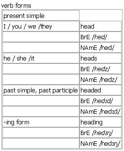 head [head heads headed heading] noun, verb BrE [hed] NAmE [hed] noun PART OF BODY 1. countable the part of the body on top of the neck containing the eyes, nose, mouth and brain • She nodded her head in agreement. • He shook his head in disbelief. •The boys hung their heads in shame. •The driver suffered head injuries. •She always has her head in a book (= is always reading). •He still has a good head of hair (= a lot of hair).  see also ↑death's head MIND 2. countable the mind or brain • I sometimes wonder what goes on in that head of yours. • I wish you'd use your head (= think carefully before doing or saying sth). •The thought never entered my head. •I can't work it out in my head — I need a calculator. •I can't get that tune out of my head. •When will you get it into your head (= understand) that I don't want to discuss this any more! •For some reason, she's got it into her head (= believes) that the others don't like her. •Who's been putting such weird ideas into your head (= making you believe that)? •Try to put the exams out of your head (= stop thinking about them) for tonight. see also ↑hothead MEASUREMENT 3. a headsingular the size of a person's or animal's head, used as a measurement of distance or height •She's a good head taller than her sister. •The favourite won by a short head (= a distance slightly less than the length of a horse's head). PAIN 4. countable, usually singular (informal)a continuous pain in your head Syn: ↑headache •I woke up with a really bad head this morning. OF GROUP/ORGANIZATION 5. countable, uncountable the person in charge of a group of people or an organization •the heads of government/state • She resigned as head of department. •the crowned heads (= the kings and queens) of Europe •the head gardener/waiter, etc. • (BrE)the head boy/girl (= a student who is chosen to represent the school) OF SCHOOL/COLLEGE 6. countable (often Head) (BrE)the person in charge of a school or college Syn: ↑headmaster, Syn: headmistress, Syn: ↑head teacher • I've been called in to see the Head. •the deputy head SIDE OF COIN 7. headsuncountable the side of a coin that has a picture of the head of a person on it, used as one choice when a coin is tossed to decide sth compare ↑tails n. (7) END OF OBJECT 8. countable, usually singular ~ (of sth) the end of a long narrow object that is larger or wider than the rest of it •the head of a nail see also ↑bedhead TOP 9. singular ~ of sth the top or highest part of sth •at the head of the page •They finished the season at the head of their league. OF RIVER 10. singular the ~ of the river the place where a river begins Syn: ↑source OF TABLE 11. singular the ~ of the table the most important seat at a table •The President sat at the head of the table. OF LINE OF PEOPLE 12. singular the ~ of sth the position at the front of a line of people •The prince rode at the head of his regiment. OF PLANT 13. countable ~ (of sth) the mass of leaves or flowers at the end of a ↑stem •Remove the dead heads to encourage new growth. ON BEER 14. singular the mass of small bubbles on the top of a glass of beer OF SPOT 15. countable the part of a spot on your skin that contains a thick yellowish liquid (= ↑pus ) see also ↑blackhead IN TAPE/VIDEO RECORDER 16. countable the part of a ↑tape recorder or ↑video recorder that touches the tape and changes the electrical signals into sounds and/or pictures NUMBER OF ANIMALS 17. ~ of sth plural used to say how many animals of a particular type are on a farm, in a ↑herd, etc. •200 head of sheep OF STEAM 18. a ~ of steam singular the pressure produced by steam in a confined space •The old engine still manages to build up a good head of steam. SEX 19. uncountable (taboo, slang) ↑oral sex (= using the mouth to give sb sexual pleasure) •to give head LINGUISTICS 20. countable the central part of a phrase, which has the same ↑grammatical function as the whole phrase. In the phrase ‘the tall man in a suit’, man is the head. more at like a bear with a sore head at ↑bear n., put/lay your head/neck on the block at ↑block n., not bother yourself/your head with/about sth at ↑bother v., drum sth into sb/into sb's head at ↑drum v., have eyes in the back of your head at ↑eye n., hold/put a gun to sb's head at ↑gun n., not harm/touch a hair of sb's head at ↑hair, let your heart rule your head at ↑heart, hit the nail on the head at ↑hit v., put ideas into sb's head at ↑idea, I'll knock your block/head off! at ↑knock v., laugh your head off at ↑laugh v., need (to have) your head examined at ↑need v., (have) an old head on young shoulders at ↑old, a price on sb's head at ↑price n., sth rears its (ugly) head at ↑rear v., ring in your ears/head at ↑ring v., have a roof over your head at ↑roof n., scratch your head at ↑scratch v., sb's thick head at ↑thick adj., off the top of your head at ↑top n. Word Origin: Old English hēafod, of Germanic origin; related to Dutch hoofd and German Haupt. Thesaurus: head noun 1. C •I can't get that tune out of my head. mind • • brain • a thought enters sb's head/mind Head or mind? Head is slightly more informal than mind, and is used to talk about thoughts and ideas that get into or that you can't get out of your head. 2. C •The Bishop is head of the Church in Kenya. leader • • president • • director • • chairman • • chief executive • |BrE governor • • managing director • |informal boss • |especially journalism chief • be appointed (as) head/leader/president/director/chairman/chief executive/governor/managing director/chief take over as head/leader/president/chairman/chief executive/managing director resign/stand down/step down as head/leader/president/director/chairman/chief executive/governor/managing director/chief Collocations: Physical appearance A person may be described as having: Eyes (bright) blue/green/(d