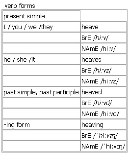 heave [heave heaves heaved hove heaving] verb, noun BrE [hiːv] NAmE [hiːv] verb 1. transitive, intransitive to lift, pull or throw sb/sth very heavy with one great effort •~ sth/sb/yourself + adv./prep. I managed to heave the trunk down the stairs. •They heaved the body overboard. •He heaved himself out of his armchair. •+ adv./prep. We all heaved on the rope. •Heave away lads! 2. intransitive to rise up and down with strong, regular movements •The boat heaved beneath them. •~ with sth Her shoulders heaved with laughter. 3. transitive ~ a sigh, etc. to make a sound slowly and often with effort •We all heaved a sigh of relief. •She heaved a long sigh. 4. intransitive to experience the tight feeling in your stomach that you get before you ↑vomit •The thought of it makes me heave. •His stomach heaved. Verb forms: Word Origin: Old English hebban, of Germanic origin; related to Dutch heffen and German heben ‘lift up’. Example Bank: •He heaved the bag up into the truck. •I gripped his arm and heaved him to his feet. •I tried to heave myself up onto my knees. •Sam heaved at the garage door. •We managed to heave his great bulk onto the bed. Idiom: ↑heave into view Derived: ↑heave to noun 1. countable an act of lifting, pulling or throwing •With a mighty heave he lifted the sack onto the truck. 2. uncountable (especially literary)a rising and falling movement •the steady heave of the sea Word Origin: Old English hebban, of Germanic origin; related to Dutch heffen and German heben ‘lift up’.