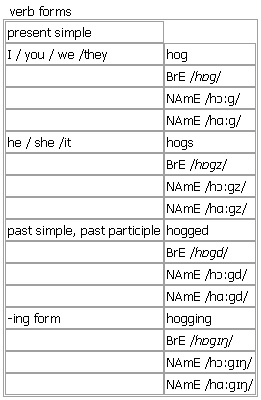 hog [hog hogs hogged hogging] noun, verb BrE [hɒɡ] NAmE [hɔːɡ] NAmE [hɑːɡ] noun 1. (especially NAmE)a pig, especially one that is kept and made fat for eating 2. (BrE)a male pig that has been castrated (= had part of its sex organs removed) and is kept for its meat compare ↑boar, ↑sow see also ↑road hog, ↑warthog Word Origin: late Old English hogg, hocg, perhaps of Celtic origin and related to Welsh hwch and Cornish hoch ‘pig, sow’. Idiom: ↑go the whole hog verb (-gg-)~ sth (informal) to use or keep most of sth yourself and stop others from using or having it •to hog the road (= to drive so that other vehicles cannot pass) •to hog the bathroom (= to spend a long time in it so that others cannot use it) Verb forms: Word Origin: late Old English hogg, hocg, perhaps of Celtic origin and related to Welsh hwch and Cornish hoch ‘pig, sow’. Example Bank: •Helen's always hogging the bathroom. •She preferred to keep in the background rather than hogging the limelight.