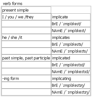 im·pli·cate AW [implicate implicates implicated implicating] BrE [ˈɪmplɪkeɪt] NAmE [ˈɪmplɪkeɪt] verb