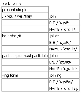 verb (jol·lies, jolly·ing, jol·lied, jol·lied)(BrE)