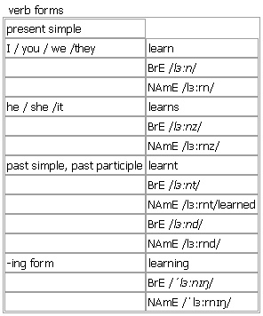 learn [learn learns learned learnt learning] BrE [lɜːn] NAmE [lɜːrn] verb (learnt, learntBrE [lɜːnt] ; NAmE [lɜːrnt] )or (learned, learned) 1. transitive, intransitive to gain knowledge or skill by studying, from experience, from being taught, etc •~ sth to learn a language/a musical instrument/a skill •~ sth from sb/sth I learned a lot from my father. •~ sth from doing sth You can learn a great deal just from watching other players. •~ (about sth) She's very keen to learn about Japanese culture. •The book is about how children learn. •~ to do sth He's learning to dance. •~ how, what, etc… He's still learning how to dance. •Today we learnt how to use the new software. 2. intransitive, transitive to become aware of sth by hearing about it from sb else Syn: ↑discover •~ of/about sth I learnt of her arrival from a close friend. •~ (that)… We were very surprised to learn (that) she had got married again. •~ who, what, etc… We only learned who the new teacher was a few days ago. •~ sth How did they react when they learned the news? •it is learned that… It has been learned that 500 jobs are to be lost at the factory. 3. transitive ~ sth to study and repeat sth in order to be able to remember it Syn: ↑memorize • We have to learn one of Hamlet's speeches for school tomorrow. 4. intransitive, transitive to gradually change your attitudes about sth so that you behave in a different way •~ (from sth) I'm sure she'll learn from her mistakes. •~ (that)… He'll just have to learn (that) he can't always have his own way. •~ to do sth I soon learned not to ask too many questions. more at know/learn/find sth to your cost at ↑cost n., you live and learn at ↑live 1, show sb/know/learn the ropes at ↑rope n. Idioms: ↑learn the hard way ▪ ↑learn your lesson Verb forms: Word Origin: Old English leornian ‘learn’ (in Middle English also ‘teach’), of West Germanic origin; related to German lernen, also to ↑lore. Thesaurus: learn verb 1. T, I •Did you learn German at school? study • • do • • memorize • • pick sth up • • know • • master • • learn/know sth by heart • • get the hang of sth • |formal acquire • learn/pick up/know sth from sb/sth learn/memorize/pick up/know/master/get the hang of what… learn/study/do/pick up/know/master/acquire a language 2. I, T (not usually used in the progressive tenses) •I learned the news from a close friend. discover • • find out (sth) • • hear • learn/find out/hear about sth learn/discover/find out the facts/truth/secret/identity be surprised/shocked/delighted/interested to learn/discover/find out/hear sth Vocabulary Building: Learning learn▪ He’s learning Spanish/to swim. study▪ She studied chemistry for three years. revise (BrE) (NAmE review) ▪ In this class we’ll revise/review what we did last week. practise (BrE) (NAmE practice) ▪ If you practise speaking English, you’ll soon improve. rehearse▪ We only had two weeks to rehearse the play. Example Bank: •Children learn very quickly. •He was eager to learn all she could teach him. •I was surprised to learn that he was only 23. •I've got a lot to learn, haven't I? •She learned from watching others. •Some people never learn, do they? •The children learn about art by painting. •They soon learn that bad behaviour is a sure-fire way of getting attention. •We first learned of the problem from her school. •You still have a lot to learn. •learning about art •Did you ever learn any languages? •Everyone learns in a slightly different way. •He learned to ride when he was about three years old. •He'll just have to learn (that) he can't always have his own way. •I learned of her arrival from a close friend. •I'll need to learn how to use the new software. •I'm sure she'll learn from her mistakes. •I've forgotten most of what I learned at school. •It's a bit overwhelming at first but don't worry, you'll soon learn. •Most of the kids here are eager to learn. •She's still quite young and she's got a lot to learn. •She's very interested in learning more about Japanese culture. •We have to learn one of Hamlet's speeches for school tomorrow. •We were very surprised to learn that she had got married again. •You can learn a great deal just from watching the other players. •You'll have to learn your lines by next week.