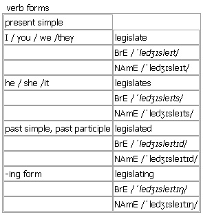 le·gis·late AW [legislate legislates legislated legislating] BrE [ˈledʒɪsleɪt] NAmE [ˈledʒɪsleɪt] verb intransitive ~ (for/against/on sth) (formal)
