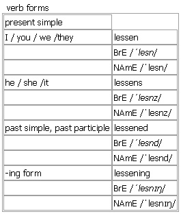 less·en [lessen lessens lessened lessening] BrE [ˈlesn] NAmE [ˈlesn] verb intransitive, transitive to become or make sth become smaller, weaker, less important, etc. Syn: ↑diminish •The noise began to lessen. •~ sth to lessen the risk/impact/effect of sth •They gave her an injection to lessen the pain. Derived Word: ↑lessening Verb forms: Example Bank: •Regular exercise can help lessen the pain. •Time had gradually lessened the pain of her grief. •Too much background detail tends to lessen the impact of the central image.