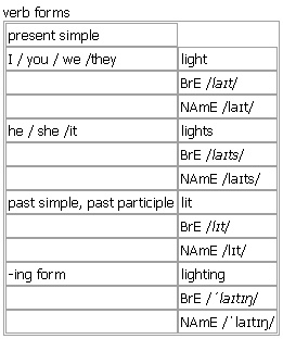 light [light lights lit lighted lighting] noun, adjective, verb, adverb BrE [laɪt] NAmE [laɪt] noun FROM SUN/LAMPS 1. uncountable the energy from the sun, a lamp, etc. that makes it possible to see things •bright/dim light •a room with good natural light •in the fading light of a summer's evening • The light was beginning to fail (= it was beginning to get dark). • She could just see by the light of the candle. •Bring it into the light so I can see it. •a beam/ray of light •The knife gleamed as it caught the light (= as the light shone on it). see also ↑first light 2. countable a particular type of light with its own colour and qualities • A cold grey light crept under the curtains. see also ↑Northern Lights LAMP 3. countable a thing that produces light, especially an electric light •to turn/switch the lights on/off •to turn out the light(s) • Suddenly all the lights went out. • It was an hour before the lights came on again. •to turn down/dim the lights •A light was still burning in the bedroom. •ceiling/wall lights •Keep going— the lights (= traffic lights) are green. •Check your car before you drive to make sure that your lights are working. see also ↑brake light, ↑green light, ↑headlight, ↑leading light, ↑red light FOR CIGARETTE 4. singular a match or device with which you can light a cigarette: (BrE) Have you got a light? • (NAmE, BrE) Do you have a light? EXPRESSION IN EYES 5. singular an expression in sb's eyes which shows what they are thinking or feeling •There was a soft light in her eyes as she looked at him. IN PICTURE 6. uncountable light colours in a picture, which contrast with darker ones •the artist's use of light and shade WINDOW 7. countable (architecture)a window or an opening to allow light in •leaded lights see also ↑skylight more at the bright lights at ↑bright adj., in the cold light of day at ↑cold adj., hide your light under a bushel at ↑hide v., jump the lights at ↑jump v., be (all) sweetness and light at ↑sweetness Word Origin: n. and v. adj. senses 1 to 2 Old English lēoht līht līhtan Germanic Dutch licht German Licht Indo-European Greek leukos ‘white’ Latin lux ‘light’ adj. senses 3 to 17 Old English lēocht līht lēohte Germanic Dutch licht German leicht Indo-European ↑lung Thesaurus: light noun 1. U, sing. •She could just see by the light of the candle. brightness • • lighting • Opp: darkness, Opp: the dark, Opp: shade light/brightness from sth in the light/brightness good/bright/strong/poor/electric light/lighting give light/brightness to sth 2. C •Turn on the lights! lamp • • candle • • lantern • |BrE torch • |especially AmE flashlight • switch on/off a light/lamp/torch/flashlight shine a light/lantern/torch/flashlight on sth a light/lamp/lantern/torch/flashlight shines Which Word?: light / lighting The noun light has several different meanings and is used in many phrases. Lighting can only be used to talk about the type of light in a place or how lights are used to achieve a particular effect: ▪ the lighting system ◇ ▪ the movie’s interesting lighting effects ◇ ▪ The lighting at the disco was fantastic. Example Bank: •A warning light goes on when the battery is running low. •Bring it into the light and we'll have a look at it. •Could you give me a light? •For the first time since the start of his treatment, we can now see light at the end of the tunnel. •He flashed his lights to warn the oncoming cars. •In full light, you could see Alison was well over forty. •Light from a tall lamp fell in a pool on the desk. •Nothing can travel faster than the speed of light. •She held up the letter against the light. •Some cars already had their lights on. •Some of his paintings never even saw the light of day. •Someone shone a light in my face. •The blue light was flashing. •The car was stopped at the side of the road with its hazard lights flashing. •The lamp was the only source of light in the room. •The light flickered a couple of times then went out. •The light reflecting off the snow was dazzling. •The pilot could just make out the runway landing lights. •The place looked calm in the golden evening light. •The warning light came on. •There was a flash of light followed by an explosion. •They managed to see where the door was by the light of the moon. •We could hardly see the ball in the failing light. •We were momentarily blinded by the light of the sun. •You could see the imperfections in the repair when the light caught it. •film that is sensitive to ultraviolet light •in the cold light of morning •light emitted by a star •the bright lights of the city •the light from the kitchen window •Check your car before you drive to make sure that your lights are working. •Examine the artist's use of light and shade. •He squinted in the bright light. •It was getting dark and the street lights had come on. •Keep going— the lights are green. •Suddenly all the lights went out. •The light was beginning to fail. •The lights dimmed and the curtain rose. •Turn on the lights! •We could only just make out the path in the dim light. •a beam/ray of light Idioms: ↑according to somebody's lights ▪ ↑bring something to light ▪ ↑cast light on something ▪ ↑come to light ▪ in a good/bad/favourable light ▪ ↑in somebody's light ▪ ↑in the light of something ▪ ↑light at the end of the tunnel ▪ ↑light dawned ▪ ↑light of somebody's life ▪ ↑light on something ▪ ↑light touch ▪ ↑lights are on but nobody's home ▪ ↑make light of something ▪ ↑make light work of something ▪ out like a light ▪ ↑run a light ▪ ↑run the lights ▪ ↑see the light ▪ ↑set light to something Derived Word: ↑lightness Derived: ↑light on something ▪ ↑light something up ▪ ↑light up adjective (light·er, light·est) WITH NATURAL LIGHT 1. full 