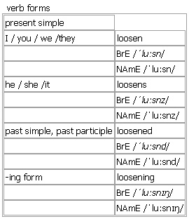loos·en [loosen loosens loosened loosening] BrE [ˈluːsn] NAmE [ˈluːsn] verb 1. transitive, intransitive ~ (sth) to make sth less tight or firmly fixed; to become less tight or firmly fixed Syn: ↑slacken •First loosen the nuts, then take off the wheel. •The rope holding the boat loosened. 2. transitive ~ sth to make a piece of clothing, hair, etc. loose, when it has been tied or fastened 3. transitive ~ your hands, hold, etc. to hold sb/sth less tightly •He loosened his grip and let her go. • (figurative)The military regime has not loosened its hold on power. 4. transitive ~ sth to make sth weaker or less controlled than before Syn: ↑relax •The party has loosened its links with big business. Opp: ↑tighten Idiom: ↑loosen somebody's tongue Derived: ↑loosen somebody up ▪ ↑loosen up Verb forms: Example Bank: •She loosened her hair so that it fell over her shoulders. •The rope holding the boat had loosened.