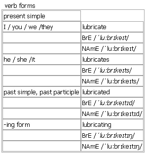 lu·bri·cate [lubricate lubricates lubricated lubricating] BrE [ˈluːbrɪkeɪt] NAmE [ˈluːbrɪkeɪt] verb ~ sth