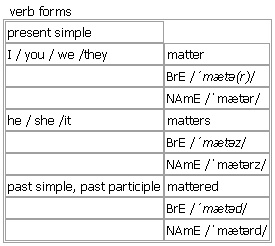 mat·ter [matter matters mattered mattering] noun, verb BrE [ˈmætə(r)] NAmE [ˈmætər] noun SUBJECT/SITUATION 1. countable a subject or situation that you must consider or deal with Syn: ↑affair • It's a private matter. • They had important matters to discuss. •She may need your help with some business matters. •I always consulted him on matters of policy. •It's a matter for the police (= for them to deal with). •That's a matter for you to take up with your boss. •Let's get on with the matter in hand (= what we need to deal with now). •I wasn't prepared to let the matter drop (= stop discussing it). •It was no easy matter getting him to change his mind. •It should have been a simple matter to check. • (ironic)And then there's the little matter of the fifty pounds you owe me. • (formal)It was a matter of some concern to most of those present (= something they were worried about). •I did not feel that we had got to the heart of the matter (= the most important part). •And that is the crux of the matter (= the most important thing about the situation). 2. mattersplural the present situation, or the situation that you are talking about Syn: ↑things • Unfortunately, there is nothing we can do to improve matters. • I'd forgotten the keys, which didn't help matters. •Matters were made worse by a fire in the warehouse. •And then, to make matters worse, his parents turned up. •I decided to take matters into my own hands (= deal with the situation myself). •Matters came to a head (= the situation became very difficult) with his resignation. PROBLEM 3. the mattersingular used (to ask) if sb is upset, unhappy, etc. or if there is a problem •What's the matter? Is there something wrong? • Is anything the matter? •~ with sb/sth Is something the matter with Bob? He seems very down. •There's something the matter with my eyes. •‘We've bought a new TV.’ ‘What was the matter with the old one?’ •What's the matter with you today (= why are you behaving like this)? •What on earth was the matter with her, she wondered. She'd come here to enjoy herself and here she was, stuck on her own in the hotel. A MATTER OF STH/OF DOING STH 4. singular a situation that involves sth or depends on sth Syn: ↑question • Learning to drive is all a matter of coordination. • Planning a project is just a matter of working out the right order to do things in. •That's not a problem. It's simply a matter of letting people know in time. •Some people prefer the older version to the new one. It's a matter of taste. •She resigned over a matter of principle. •The government must deal with this as a matter of urgency. •Just as a matter of interest (= because it is interesting, not because it is important), how much did you pay for it? •‘I think this is the best so far.’ ‘Well, that's a matter of opinion (= other people may think differently). SUBSTANCE 5. uncountable (physics)physical substance in general that everything in the world consists of; not mind or spirit •to study the properties of matter 6. uncountable (formal)a substance or things of a particular sort • Add plenty of organic matter to improve the soil. •elimination of waste matter from the body • She didn't approve of their choice of reading matter. see also ↑subject matter more at fact of the matter is (that)… at ↑fact, be no laughing matter at ↑laughing Word Origin: Middle English: via Old French from Latin materia ‘timber, substance’, also ‘subject of discourse’, from mater ‘mother’. Thesaurus: matter noun 1. C •We had important matters to discuss. question • • issue • • concern • • subject • a/an matter/question/issue relating to/concerning sth a key/major/serious/general matter/question/issue/concern/subject a/an political/moral/technical matter/question/issue/concern/subject raise/deal with/address/tackle/discuss/consider/examine/explore/focus on a/an matter/question/issue/concern/subject Matter or question? In many cases you can use either word. However, a matter is often sth practical, whereas a question may be sth more philosophical. 2. sing. (especially spoken) •What's the matter? problem • • difficulty • • issue • |disapproving trouble • the matter/a problem/a difficulty/an issue/trouble with sth Example Bank: •Do I have any choice in the matter? •Getting the effect you want is a matter of trial and error. •He left, saying he had pressing matters to attend to. •His articles deal with a wide range of subject matter. •His lawyer advised him to drop the matter. •I don't have much experience in these matters. •I don't mind lizards, but snakes are a different matter. •I don't really want to go into this matter now. •I thought I'd better broach the matter with my boss. •I wasn't sure how to approach the delicate matter of pay. •It didn't help matters that I had a terrible cold. •It is no simple matter starting a new business. •It is then a simple matter to print off the data you have collected. •It's a matter of concern to all of us. •It's a relief to have the matter settled. •Let me simplify matters by giving you my answer now. •Let's concentrate on the matter in hand for now, and leave other issues till later. •Police are treating the matter as a murder enquiry. •She always arranges matters to suit herself. •She refused to let the matter rest. •She was a great source of knowledge on matters relating to nutrition. •Speak to your manager if you need help on this matter. •The incident is definitely a matter for the police. •The matter will be raised at our next meeting. •The question of his innocence is a weighty matter for this court. •The rest of the meeting was taken up by routine matters. •The safety of his family was no laughing matter. •They talk mostly about work and related matters. •They've agreed in theory, but now we need to discuss practical matters. •To