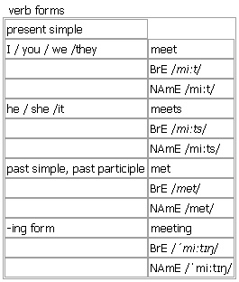 meet [meet meets met meeting] verb, noun BrE [miːt] NAmE [miːt] verb (met, metBrE [met] ; NAmE [met] ) BY CHANCE 1. intransitive, transitive, no passive to be in the same place as sb by chance and talk to them • Maybe we'll meet again some time. •~ sb Did you meet anyone in town? BY ARRANGEMENT 2. intransitive, transitive, no passive to come together formally in order to discuss sth • The committee meets on Fridays. •~ sb The Prime Minister met other European leaders for talks. •~ with sb The President met with senior White House aides. 3. intransitive, transitive, no passive to come together socially after you have arranged it •~ (for sth) Let's meet for a drink after work. •~ sb (for sth) We're meeting them outside the theatre at 7. 4. transitive ~ sb/sth to go to a place and wait there for a particular person to arrive • Will you meet me at the airport? • The hotel bus meets all incoming flights. •I met him off the plane. FOR THE FIRST TIME 5. transitive, no passive, intransitive ~ (sb) to see and know sb for the first time; to be introduced to sb • Where did you first meet your husband? • (especially BrE)Pleased to meet you. • (NAmE)Nice meeting you. •There's someone I want you to meet. •I don't think we've met. IN CONTEST 6. intransitive, transitive, no passive to play, fight, etc. together as opponents in a competition •Smith and Jones met in last year's final. •~ sb Smith met Jones in last year's final. EXPERIENCE STH 7. transitive ~ sth to experience sth, often sth unpleasant • Others have met similar problems. • How she met her death will probably never be known. Syn: ↑come across, Syn: ↑encounter TOUCH/JOIN 8. intransitive, transitive to touch sth; to join • The curtains don't meet in the middle. •~ sth That's where the river meets the sea. •His hand met hers. SATISFY 9. transitive ~ sth to do or satisfy what is needed or what sb asks for Syn: ↑fulfil • How can we best meet the needs of all the different groups? • Until these conditions are met we cannot proceed with the sale. •I can't possibly meet that deadline. PAY 10. transitive ~ sth to pay sth •The cost will be met by the company. more at make (both) ends meet at ↑end n., find/meet your match at ↑match n., where the rubber meets the road at ↑rubber, never the twain shall meet at ↑twain Verb forms: Word Origin: Old English mētan ‘come upon’, of Germanic origin; related to Dutch moeten, also to ↑moot. Thesaurus: meet verb 1. I, T, no passive •I hope we'll meet again soon. informal run into sb • • bump into sb • |formal encounter • meet/run into/bump into a friend 2. I, T, no passive •The committee meets on Fridays. meet with sb • • gather • • mass • • assemble • • rally • |informal get together • • meet up • |formal convene • meet/meet with sb/gather/mass/assemble/rally/get together/meet up/convene for sth meet/get together/meet up with sb meet/meet with sb/gather/get together/convene regularly 3. T •Will you meet me at the airport? greet • • welcome • |formal receive • meet/greet/welcome/receive sb with a smile, etc. meet/greet/welcome/receive a guest/visitor be there to meet/greet/welcome/receive sb 4. T, no passive, I •Where did you two first meet? get to know sb • |formal make sb's acquaintance • first meet/get to know/make the acquaintance of sb 5. I, T •The curtains don't meet in the middle. touch • • cross • • join • • merge • rivers meet/join/merge roads/paths meet/cross/join not quite/almost/nearly meet/cross/touch 6. T •How can we meet the needs of all these different groups? satisfy • • serve • • suit • |BrE, formal fulfil • |AmE fulfill • meet/satisfy/serve/suit/fulfil a requirement/need/purpose meet/satisfy/suit/fulfil a demand/condition meet/satisfy/fulfil a/an standard/obligation meet/satisfy/fulfil the terms/criteria Example Bank: •A year or so later I happened to meet him again. •He had failed to meet his performance targets. •I arranged to meet her for lunch. •I look forward to meeting you next week. •I met up with my friends in town. •Leonora met his gaze without flinching. •Management will meet with union representatives next week. •The course is designed to meet the needs of young learners. •The three sisters rarely meet in person, but spend hours on the phone. •They were determined to meet the challenge head-on. •We met the next day at a local bar. •We met up after school. •When these two finally met, the connection was electric. •an interactive site where people can meet online •the place where they had first met •50% of the candidates failed to meet the standard required. •I can't possibly meet that deadline. •I don't think we've met. •I hope we'll meet again soon. •Let's meet for a drink after work. •Many families on these estates are struggling to meet their financial commitments. •Nice to meet you. •That's where the river meets the sea. •The company will meet the cost of the journey. •The curtains don't meet in the middle. •The school had to sell off its playing fields to meet its debt repayments. •There's someone I want you to meet. •Until these conditions are met we can't proceed with the sale. •We're meeting them outside the theatre at 7. Idioms: ↑meet somebody halfway ▪ ↑meet somebody's eye ▪ meet somebody's gaze/look ▪ ↑meet your Maker ▪ ↑people's eyes meet ▪ ↑there is more to somebody than meets the eye Derived: ↑meet something with something ▪ ↑meet up ▪ ↑meet with somebody ▪ ↑meet with something noun 1. (especially NAmE)a sports competition •a track meet 2. (BrE)an event at which horse riders and dogs hunt foxes. Fox-hunting with dogs is now illegal in the UK. Word Origin: Old English mētan ‘come upon’, of Germanic origin; related to Dutch moeten, also to ↑moot. Example Bank: •Brooke missed the meet due to illness. •Did you buy 