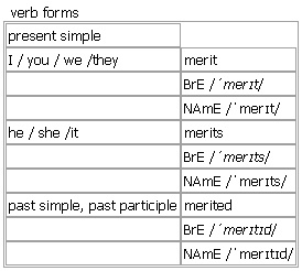 merit [merit merits merited meriting] noun, verb BrE [ˈmerɪt] NAmE [ˈmerɪt] noun 1. uncountable (formal)the quality of being good and of deserving praise, reward or admiration Syn: ↑worth •a work of outstanding artistic merit •The plan is entirely without merit. •I want to get the job on merit. •He was awarded a certificate of merit for his piano playing. 2. countable, usually plural a good feature that deserves praise, reward or admiration Syn: ↑strength •We will consider each case on its (own) merits (= without considering any other issues, feelings, etc.). •They weighed up the relative merits of the four candidates. 3. countable (BrE)a mark/grade in an exam or for a piece of work at school or university which is excellent 4. countable (BrE)a mark/grade given as a reward for good behaviour at school Word Origin: Middle English (originally in the sense ‘deserved reward or punishment’): via Old French from Latin meritum ‘due reward’, from mereri ‘earn, deserve’. Example Bank: •Films are given a rating of one to five stars according to merit. •I began to question the merits of these new technologies. •I can see no merit in excluding the child from school. •I find no merit at all in any of the arguments. •I found no artistic merit in this film. •Other schools already have merit systems in place that reward good work. •Prizes are awarded entirely on merit. •She proved her merit as a serious actress. •She received a merit award for outstanding work. •She saw the merit in this arrangement. •She was elected on personal merit. •The film has no artistic merit whatsoever. •The play lacked artistic merit. •The winners are ranked in order of merit. •There is lots of merit to the idea. •There is some merit in his argument. •We need to assess the merits of both proposals before making our decision. •We need to consider the relative merits of both makes of cooker. •a lawsuit that lacked any real merit •decisions on merit raises and promotions •I want to get the job on merit. •It's a work of outstanding artistic merit. •We will consider each case on its (own) merits. •Whatever the artist's individual merits, he really can't compete with the great painters. verb (not used in the progressive tenses)~ (doing) sth (formal) to do sth to deserve praise, attention, etc. Syn: ↑deserve •He claims that their success was not merited. •The case does not merit further investigation. Verb forms: Word Origin: Middle English (originally in the sense ‘deserved reward or punishment’): via Old French from Latin meritum ‘due reward’, from mereri ‘earn, deserve’. Example Bank: •The question hardly merits an answer. •His discussion paper merits further consideration. •Their efforts merit recognition. •This problem merits expert advice.
