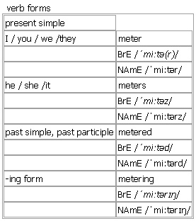 meter [meter meters metered metering] noun, verb BrE [ˈmiːtə(r)] NAmE [ˈmiːtər] noun 1. (especially in compounds)a device that measures and records the amount of electricity, gas, water, etc. that you have used or the time and distance you have travelled, etc •A man came to read the gas meter. •The cab driver left the meter running while he waited for us. see also ↑light meter 2. = ↑parking meter 3. -meter (in compounds)a device for measuring the thing mentioned •speedometer •altimeter •calorimeter 4. (NAmE) = ↑metre •Who holds the record in the 100 meters? Word Origin: v. and n. senses 1 to 2 Middle English (in the sense ‘person who measures’): from ↑mete + ↑-er. The current sense dates from the 19th cent. Example Bank: •The electricity company will send an employee to read your meter. •The taxi driver kept the meter running. •The taxi waited, its motor running, the meter ticking away. •The taxi waited, the meter ticking away. •The token meter is operated by tokens costing £1 or £5. •a man in uniform checking the parking meters verb ~ sth to measure sth (for example how much gas, electricity, etc. has been used) using a ↑meter Verb forms: Word Origin: v. and n. senses 1 to 2 Middle English (in the sense ‘person who measures’): from ↑mete + ↑-er. The current sense dates from the 19th cent.