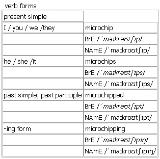 micro·chip [microchip microchips] noun, verb BrE [ˈmaɪkrəʊtʃɪp] NAmE [ˈmaɪkroʊtʃɪp] noun (also chip) a very small piece of a material that is a ↑semiconductor, used to carry a complicated electronic ↑circuit verb (-pp-)~ sth to put a microchip under the skin of an animal as a way of identifying it •Our dog has been microchipped and vaccinated against rabies. Verb forms: See also: ↑chip