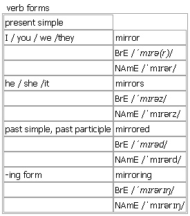 mir·ror [mirror mirrors mirrored mirroring] noun, verb BrE [ˈmɪrə(r)] NAmE [ˈmɪrər]