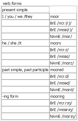 moor [moor moors moored mooring] noun, verb BrE [mɔː(r)] BrE [mʊə(r)] NAmE [mʊr] noun (especially BrE) 1. countable, usually plural a high open area of land that is not used for farming, especially an area covered with rough grass and ↑heather •the North York moors •to go for a walk on the moors 2. uncountable = ↑moorland •moor and rough grassland Word Origin: n. Old English mōr Germanic v. late 15th cent. Germanic Dutch meren Example Bank: •We got lost on the moors. •the slopes leading down from the moor •the wind blowing across the moors •We went for a walk on the moors. verb intransitive, transitive to attach a boat, ship, etc. to a fixed object or to the land with a rope, or ↑anchor it Syn: ↑tie up •We moored off the north coast of the island. •~ sth (to sth) A number of fishing boats were moored to the quay. Verb forms: Word Origin: n. Old English mōr Germanic v. late 15th cent. Germanic Dutch meren