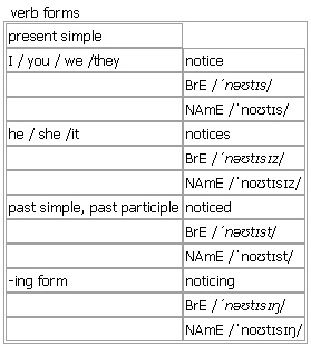 no·tice [notice notices noticed noticing] noun, verb BrE [ˈnəʊtɪs] NAmE [ˈnoʊtɪs] noun PAYING ATTENTION 1. uncountable the fact of sb paying attention to sb/sth or knowing about sth •Don't take any notice of what you read in the papers. •Take no notice of what he says. •These protests have really made the government sit up and take notice (= realize the importance of the situation). •It was Susan who brought the problem to my notice (= told me about it). •Normally, the letter would not have come to my notice (= I would not have known about it). • (formal)It will not have escaped your notice that there have been some major changes in the company. GIVING INFORMATION 2. countable a sheet of paper giving written or printed information, usually put in a public place • There was a notice on the board saying the class had been cancelled. • A public notice about the planned development was pinned to the wall. 3. countable a board or sign giving information, an instruction or a warning •a notice saying ‘Keep off the Grass’ ANNOUNCING STH 4. countable a small advertisement or ↑announcement in a newspaper or magazine •notices of births, marriages and deaths 5. countable a short ↑announcement made at the beginning or end of a meeting, a church service, etc •There are just two notices this week. WARNING 6. uncountable information or a warning given in advance of sth that is going to happen • You must give one month's notice. • Prices may be altered without notice. •The bar is closed until further notice (= until you are told that it is open again). •You are welcome to come and stay as long as you give us plenty of notice. WHEN LEAVING JOB/HOUSE 7. uncountable a formal letter or statement saying that you will or must leave your job or house at the end of a particular period of time •He has handed in his notice. •They gave her two weeks' notice. •Tenants must give written notice to the landlord of their intention to move out of the property. •Dozens of families on the estate have been give notice to quit (= told to leave their homes). •500 workers have been issued with redundancy notices. •We received an eviction notice today. REVIEW OF BOOK/PLAY 8. countable a short article in a newspaper or magazine, giving an opinion about a book, play, etc •The play got good notices in the national press. Word Origin: late Middle English (in sense 6 of the noun): from Old French, from Latin notitia ‘being known’, from notus ‘known’, past participle of noscere. Thesaurus: notice noun 1. U •Susan brought the problem to my notice. attention • careful/public notice/attention attract/bring sth to/come to/escape sb's notice/attention 2. C •A notice on the board said the class was cancelled. poster • • placard • • handout • • flyer • • circular • • leaflet • sth is on a notice/poster/placard/handout/flyer/circular display a notice/poster/placard put up/stick up a notice/poster 3. C •The notice read ‘Keep off the grass’. sign • • board • • plaque • on a notice/sign/board/plaque put up/see/read a notice/sign/board/plaque a notice/sign/board/plaque appears/goes up a notice/sign/plaque says/reads sth Notice or sign? A notice always gives its information in words; a sign often uses pictures or symbols: •a road/traffic/shop/pub sign ✗ a road/traffic/shop/pub notice 4. U •Prices may be altered without notice. warning • notice/warning of sth notice/warning that… adequate/advance/ample/prior/written notice/warning Example Bank: •His landlord gave him two months' notice to quit. •I caught notice of a small scrap of paper on my desk. •It won't have escaped your notice that I'm feeling rather pleased with myself. •It's the best we can do at such short notice. •Normally such matters would not come to my notice. •She's given notice that she intends to leave. •She's on a week's notice, which doesn't give her long to find another job. •Take no notice of what you read in the papers. •The bank requires three days' notice. •The change was too subtle to attract much notice. •The company has issued warning notices saying that all water should be boiled. •The disease came to public notice in the 80s. •The notice about his resignation went up this morning. •The team is ready to go anywhere in the world at a moment's notice. •The tenants could soon be served with eviction notices. •There are notices about where to park. •They cut off the electricity without notice. •This new law serves notice that criminals will not go unpunished. •A public notice about the planned development was pinned to the wall. •He has handed in his notice. •It was Susan who brought the problem to my notice. •It will not have escaped your notice that there have been some changes in the company. •Normally, the letter would not have come to my notice. •Take no notice of what he says. •The bar is closed until further notice. •The protest really made the government sit up and take notice. •There was a notice on the board saying the class had been cancelled. •There was a notice saying ‘Keep off the Grass’. •You are welcome to come and stay as long as you give us plenty of notice. •You must give one month's notice of your intention to move out of the property. Idioms: ↑at a moment's notice ▪ ↑at short notice ▪ ↑on short notice verb (not usually used in the progressive tenses) SEE/HEAR 1. intransitive, transitive to see or hear sb/sth; to become aware of sb/sth • People were making fun of him but he didn't seem to notice. •~ sb/sth The first thing I noticed about the room was the smell. •~ (that)… I couldn't help noticing (that) she was wearing a wig. •~ how, what, etc… Did you notice how Rachel kept looking at her watch? •~ sb/sth do sth I noticed them come in. •~ sb/sth doing sth I didn't notice him leaving. PAY ATTENTION 2. transitive ~ sb/sth to pay attention to sb/st