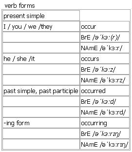 occur AW [occur occurs occurred occurring] BrE [əˈkɜː(r)] NAmE [əˈkɜːr] verb (-rr-) 1. intransitive (formal)to happen • When exactly did the incident occur? • Something unexpected occurred. 2. intransitive + adv./prep. to exist or be found somewhere • Sugar occurs naturally in fruit. Derived: ↑occur to somebody Verb forms: Word Origin: late 15th cent.: from Latin occurrere ‘go to meet, present itself’, from ob- ‘against’ + currere ‘to run’. Thesaurus: occur verb 1. I (formal) •Something unexpected occurred. happen • • take place • • come up • • come about • • present itself • • crop up • |formal arise • a change occurs/happens/takes place/comes about/arises a situation occurs/happens/comes about/presents itself/arises an event/accident occurs/happens/takes place 2. I (formal) (not used in the progressive tenses; used with an adverb or preposition) •Sugar occurs naturally in fruit. exist • • be found • |formal prevail • occur/exist/be found/prevail in/among sth still occur/exist/be found/prevail never occur/exist/be found Example Bank: •Opportunities for learning occur spontaneously every day. •These chemical changes occur naturally. •the problems that occur among people living together •A new outbreak of smallpox occurred in 1928. •Impact occurred seconds after the pilot signalled for help. •Lemurs occur in the wild only in Madagascar. •Major economic changes have occurred recently. •More deaths occur in winter. •Peasant rebellions occurred throughout the 16th century. •The collision occurred near the hospital. •The explosion occurred just after midday. •The fits usually occur at night. •These climate shifts occurred over less than a decade. •Travellers complained about lack of information when travel delays occurred.