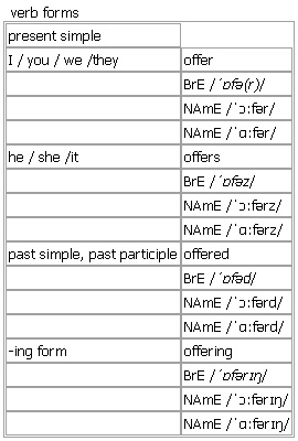 offer [offer offers offered offering] verb, noun BrE [ˈɒfə(r)] NAmE [ˈɔːfər] NAmE [ˈɑːfər] verb 1. transitive, intransitive to say that you are willing to do sth for sb or give sth to sb •~ (sth) Josie had offered her services as a guide • He offered some useful advice. • I don't think they need help, but I think I should offer anyway. •~ sth (to sb) (for sth) He offered $4 000 for the car. •They are offering a reward for the return of their cat. •They decided to offer the job to Jo. •~ sb sth They decided to offer Jo the job. •I gratefully took the cup of coffee she offered me. •Taylor offered him 500 dollars to do the work. •~ to do sth The kids offered to do the dishes. •+ speech ‘I'll do it,’ she offered. 2. transitive ~ sth to make sth available or to provide the opportunity for sth • The hotel offers excellent facilities for families. • The job didn't offer any prospects for promotion. •He did not offer any explanation for his behaviour. 3. transitive ~ sth/sb (up) (to sb) (formal)to give sth to God •We offered up our prayers for the men's safe return. Verb forms: Word Origin: Old English offrian ‘sacrifice something to a deity’, of Germanic origin, from Latin offerre ‘bestow, present’ (in ecclesiastical Latin ‘offer to God’), reinforced by French offrir (which continued to express the primary sense). The noun (late Middle English) is from French offre. Thesaurus: offer verb 1. T •Jill offered to do the dishes. volunteer • • bid • • hold sth out • offer/volunteer/bid for sth offer sth/hold sth out to sb offer/volunteer to do sth offer/bid £2 000/a sum 2. T •The hotel offers excellent facilities for families. hold out sth • |formal extend • • tender • |written volunteer • offer/hold out the hope/possibility/prospect of sth offer/extend an invitation/a welcome/hospitality/sympathy/congratulations/aid/credit offer/tender advice/your apologies/your resignation offer/volunteer information/a suggestion/an opinion Example Bank: •‘Do you need any help?’ he offered impulsively. •Hospitality was freely offered to refugees. •I refer to your recent application and interview and am pleased to offer you the post of editor. •She felt obliged to offer him a bed for the night. •She graciously offered to get pizza so I wouldn't have to cook. •She offered drinks to her guests. •The open evening is a chance to see what the college has to offer students. •The plan seemed to offer real advantages. •They claim to offer a more comprehensive service than other companies. •They have offered over £500 000 for the house. •This investment is likely to offer a higher return. •This player has proved that he still has a lot to offer. •Would they be prepared to offer any more? •the protection that life insurance can offer •‘I'll do it,’ she offered. •He offered £4 000 for the car. •Taylor offered him $500 to do the work. •The job didn't offer any prospects for promotion. Idioms: ↑have something to offer ▪ ↑offer your hand ▪ ↑on offer ▪ ↑under offer noun 1. an act of saying that you are willing to do sth for sb or give sth to sb •~ (of sth) Thank you for your kind offer of help. •to accept/refuse/decline an offer • I took him up on his offer of a loan. •You can't just turn down offers of work like that. •an offer of marriage •~ to do sth I accepted her offer to pay. 2. ~ (for sth) an amount of money that sb is willing to pay for sth • I've had an offer of $2 500 for the car. • They've decided to accept our original offer. •The offer has been withdrawn. •They made me an offer I couldn't refuse. •The original price was £3 000, but I'm open to offers (= willing to consider offers that are less than that). see also ↑o.n.o. 3. a reduction in the normal price of sth, usually for a short period of time • This special offer is valid until the end of the month. • See next week's issue for details of more free offers. •They have an offer on beer at the moment. Word Origin: Old English offrian ‘sacrifice something to a deity’, of Germanic origin, from Latin offerre ‘bestow, present’ (in ecclesiastical Latin ‘offer to God’), reinforced by French offrir (which continued to express the primary sense). The noun (late Middle English) is from French offre. Thesaurus: offer noun 1. C •Thank you for your kind offer of help. proposal • • approach • • overture • • advances • an offer/a proposal/an approach/overtures/advances to sb an offer/a proposal of marriage make/receive an offer/a proposal/an approach/overtures/advances accept/decline/refuse/turn down an offer/a proposal 2. C •They made an offer of £3 000. especially business journalism bid • |especially BrE, business tender • a/an offer/bid/tender for sth put in/receive/accept a/an offer/bid/tender invite offers/bids/tenders Example Bank: •Don't just accept the first offer. •Excellent condition. $1 000 or best offer. •He made me an offer I simply couldn't refuse. •I got the conditioner in a free offer with my shampoo. •I had to turn down a job offer from a publisher because the pay was too low. •I'll listen to any reasonable offer. •No one has made a firm offer. •Several people put in an offer for the house. •She received a conditional offer from the University of Warwick. •The Rams have made him a two-year contract offer. •The asking price is £500 but I'm open to offers. •The company has made a conditional offer. •The company says it has made a good offer which cannot be improved upon. •The council do cheap offers on compost bins. •The property is currently under offer to a client. •The union has voted for industrial action after rejecting a pay offer. •They accepted our offer of £80 000. •They are selling their car for £2 500 or near offer. •They just kept upping their offer until I had to say yes. •They refused our offer of help. 