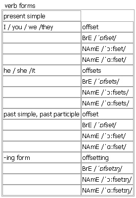 off·set AW [offset offsets offsetting] verb, adjective BrE [ˈɒfset] NAmE [ˈɔːfset] NAmE [ˈɑːfset]