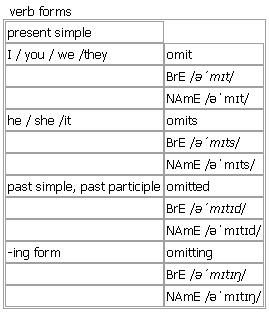 omit [omit omits omitted omitting] BrE [əˈmɪt] NAmE [əˈmɪt] verb (-tt-)(formal) 1. to not include sth/sb, either deliberately or because you have forgotten it/them Syn: leave out •~ sth/sb If you are a student, you can omit questions 16–18. •~ sth/sb from sth People were surprised that Smith was omitted from the team. 2. ~ to do sth to not do or fail to do sth •She omitted to mention that they were staying the night. Verb forms: Word Origin: late Middle English: from Latin omittere, from ob- ‘down’ + mittere ‘let go’. Example Bank: •He was controversially omitted from the World Cup side. •Some important details were deliberately omitted from the report. •The acknowledgements were inadvertently omitted from the article. •This fact had been conveniently omitted from his account of events. •This scene is usually cut down or omitted altogether.