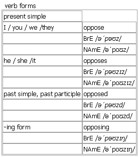 op·pose [oppose opposes opposed opposing] BrE [əˈpəʊz] NAmE [əˈpoʊz] verb 1. to disagree strongly with sb's plan, policy, etc. and try to change it or prevent it from succeeding •~ sb/sth This party would bitterly oppose the re-introduction of the death penalty. • He threw all those that opposed him into prison. •~ (sb/sth) doing sth I would oppose changing the law. compare ↑propose 2. ~ sb to compete with sb in a contest • He intends to oppose the prime minister in the leadership election. Verb forms: Word Origin: late Middle English: from Old French opposer, from Latin opponere (from ob- ‘against’ + ponere ‘place’), but influenced by Latin oppositus ‘set or placed against’ and Old French poser ‘to place’. Thesaurus: oppose verb T •I would oppose changing the law. resist • • fight • • combat • • defy • • go against sb/sth • • stand up to sb • • flout • Opp: support, Opp: propose oppose/resist/fight a plan/proposal oppose/fight/defy/flout a ban oppose/fight/defy/stand up to the government oppose/defy/go against/flout sb's wishes Example Bank: •The ban was initially opposed by the US. •The minister has consistently opposed any relaxation in the law. •We totally oppose the use of gas to kill any animal. •We would vigorously oppose such a policy. •He found himself opposed by his own deputy.