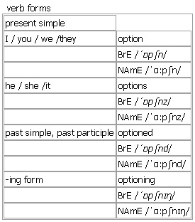 op·tion AW [option options] noun, verb BrE [ˈɒpʃn] NAmE [ˈɑːpʃn] noun 1. countable, uncountable something that you can choose to have or do; the freedom to choose what you do •As I see it, we have two options… • There are various options open to you. • We are currently studying all the options available. •Going to college was not an option for me. •I had no option but to (= I had to) ask him to leave. •~ (of doing sth) Students have the option of studying abroad in their second year. •~ (to do sth) A savings plan that gives you the option to vary your monthly payments. •He was given one month's imprisonment without the option of a fine. •This particular model comes with a wide range of options (= things you can choose to have when buying sth but which you will have to pay extra for). 2. countable a subject that a student can choose to study, but that they do not have to do • The course offers options in design and computing. 3. countable the right to buy or sell sth at some time in the future •~ (on sth) We have an option on the house. • He has promised me first option on his car (= the opportunity to buy it before anyone else). •~ (to do sth) The property is for rent with an option to buy at any time. •share options (= the right to buy shares in a company) 4. countable (computing)one of the choices you can make when using a computer program •Choose the ‘Cut’ option from the Edit menu. Word Origin: mid 16th cent.: from French, or from Latin optio(n-), from the stem of optare ‘choose’. Thesaurus: option noun C, U •As I see it, we have two options. choice • • alternative • • possibility • (a/an) real/realistic/viable/practical/obvious option/choice/alternative/possibility (a) good/healthy/preferred/cheap/expensive option/choice/alternative have the option/choice of doing sth have/give sb/offer (sb) several options/choices/alternatives/possibilities Option, choice or alternative? Alternative is slightly more formal than option or choice, and is more frequently used to talk about choosing between two things rather than several. Synonyms: option choice • alternative • possibility These are all words for sth that you choose to do in a particular situation. option • something that you can choose to have or do; the freedom to choose what you do: ▪ As I see it, we have two options… ◇ ▪ Students have the option of studying abroad in their second year. Option is also the word used in computing for one of the choices you can make when using a computer program: ▪ Choose the ‘Cut’ option from the Edit menu. choice • the freedom to choose what you do; something that you can choose to have or do: ▪ If I had the choice, I would stop working tomorrow. ◇ ▪ There is a wide range of choices open to you. alternative • something that you can choose to have or do out of two or more possibilities: ▪ You can be paid in cash weekly or by cheque monthly: those are the two alternatives. option, choice or alternative? Choice is slightly less formal than option and alternative is slightly more formal. Choice is most often used for ‘the freedom to choose’, although you can sometimes also use option (but not usually alternative): ▪ If I had the choice/option, I would… ◇ If I had the alternative, I would… ◇ ▪ parental choice in education ◇ parental option/alternative in education. Things that you can choose are options, choices or alternatives. However, alternative is more frequently used to talk about choosing between two things rather than several. possibility • one of the different things that you can do in a particular situation: ▪ We need to explore a wide range of possibilities. ◇ ▪ The possibilities are endless. Possibility can be used in a similar way to option, choice and alternative, but the emphasis here is less on the need to make a choice, and more on what is available. with/without the option/choice/possibility of sth a(n) good/acceptable/reasonable/possible option/choice/alternative the only option/choice/alternative/possibility open to sb to have a/an/the option/choice of doing sth to have no option/choice/alternative but to do sth) a number/range of options/choices/alternatives/possibilities Example Bank: •Deciding on your best option is not easy. •He thought General Studies would be a soft option. •He was jailed without the option of a fine. •He's promised me first option on his car. •Let's look at all the options available. •Look at the on-screen menu and select the ‘File’ option. •Resignation was her only option. •She took up an option in her contract to buy three million shares. •We had no option but to leave without them. •You have the option of taking your holiday early. •You have the option of working full-time or part-time. •A savings plan gives you the option to vary your monthly payments. •He was given one month's imprisonment without the option of a fine. •I had no option but to ask him to leave. •It is important at this stage to leave your options open. •There was not much option but to sell the company. •This particular model comes with a wide range of options. Idioms: ↑keep your options open ▪ ↑soft option verb ~ sth to buy or sell the right to own or use sth, at some time in the future • The novel has been optioned for the screen by his production company. • We've optioned all her books, including future ones. •This is his first script to be optioned by a film company. Verb forms: Word Origin: mid 16th cent.: from French, or from Latin optio(n-), from the stem of optare ‘choose’.