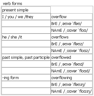 over·flow [overflow overflows overflowed overflowing] verb, noun verb BrE [ˌəʊvəˈfləʊ] ; NAmE [ˌoʊvərˈfloʊ] 1. intransitive, transitive to be so full that the contents go over the sides •The bath is overflowing •~ with sth Plates overflowed with party food. • (figurative)Her heart overflowed with love. •~ sth The river overflowed its banks. 2. intransitive ~ (with sth) (of a place)to have too many people in it •The streets were overflowing with the crowds. •The hospitals are filled to overflowing (= with patients). 3. intransitive, transitive ~ (into sth) | ~ (sth) to spread beyond the limits of a place or container that is too full •The meeting overflowed into the street. Verb forms: Word Origin: Old English oferflōwan (see ↑over-, ↑flow). Example Bank: •His bag was overflowing with clothes. •The chemicals overflowed from their storage tank. •The river had overflowed into the fields. •If it keeps raining the river could overflow its banks. •The bath is overflowing! noun BrE [ˈəʊvəfləʊ] ; NAmE [ˈoʊvərfloʊ] 1. uncountable, singular a number of people or things that do not fit into the space available •A new office block was built to accommodate the overflow of staff. •an overflow car park 2. uncountable, singular the action of liquid flowing out of a container, etc. that is already full; the liquid that flows out •an overflow of water from the lake • (figurative)an overflow of powerful emotions 3. (also ˈoverflow pipe)countable a pipe that allows extra liquid to escape 4. countable, usually singular (computing)a fault that happens because a number or data item (for example, the result of a calculation) is too large for the computer to represent it exactly Word Origin: Old English oferflōwan (see ↑over-, ↑flow).