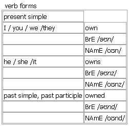 own [own owns owned owning] adjective, pronoun, verb BrE [əʊn] NAmE [oʊn] adjective, pronoun 1. used to emphasize that sth belongs to or is connected with sb • It was her own idea. • I saw it with my own eyes (= I didn't hear about it from somebody else). •Is the car your own? •Your day off is your own (= you can spend it as you wish). •Our children are grown up and have children of their own. •For reasons of his own (= particular reasons that perhaps only he knew about), he refused to join the club. •The accident happened through no fault of her own. •He wants to come into the business on his own terms. •I need a room of my own. •I have my very own room at last. Own cannot be used after an article •I need my own room. •I need an own room. •It's good to have your own room. •It's good to have the own room. 2. done or produced by and for yourself • She makes all her own clothes. • He has to cook his own meals. more at the devil looks after his own at ↑devil, have a mind of your own at ↑mind n., for sth's own sake at ↑sake 1, like, etc. the sound of your own voice at ↑sound n. Word Origin: Old English āgen (adjective and pronoun) ‘owned, possessed’, past participle of āgan ‘owe’; the verb (Old English āgnian ‘possess’, also ‘make own's own’) was originally from the adjective, later probably reintroduced from ↑owner. Thesaurus: own adj. •I have my own room at last. personal • • individual • • private • |sometimes disapproving subjective • sb's own/personal/individual/private/subjective experience sb's own/personal/private/subjective opinion sb's own/personal/individual needs/requirements/objectives/freedom Example Bank: •He wants to come into the business on his own terms. •I need a room of my own. •I saw it with my own eyes. •It's good to have your own room. •Our children are grown up and have children of their own. •The accident happened through no fault of her own. •Your day off is your own. Idioms: ↑act as if you own the place ▪ ↑come into its own ▪ ↑get your own back ▪ ↑hold your own ▪ ↑on your own ▪ ↑think you own the place Derived: ↑own up verb (not used in the progressive tenses) 1. transitive ~ sth to have sth that belongs to you, especially because you have bought it • Do you own your house or do you rent it? • I don't own anything of any value. •Most of the apartments are privately owned. •an American-owned company •Does anyone own this coat? It was left in a classroom. •Don't tell me what to do— you don't own me! 2. intransitive, transitive (old-fashioned)to admit that sth is true •~ to sth/to doing sth He owned to a feeling of guilt. •~ (that)… She owned (that) she had been present. Verb forms: Word Origin: Old English āgen (adjective and pronoun) ‘owned, possessed’, past participle of āgan ‘owe’; the verb (Old English āgnian ‘possess’, also ‘make own's own’) was originally from the adjective, later probably reintroduced from ↑owner. Thesaurus: own verb T (not used in the progressive tenses) •I don't own anything of value. have • |especially BrE, especially spoken have got • |formal hold • • possess • own/have/have got/possess a car/house own/have/have got a company have/have got/hold a driving licence/passport own/hold sth legally/jointly Example Bank: •He committed the crime with a gun that he legally owned. •Only when the means of production were communally owned would classes disappear. •She owns the house jointly with her husband. •The car was once owned by Elvis Presley. •The company is a wholly owned subsidiary of SNL Research. •The museum is privately owned. •They dreamed of owning their own home. •Don't tell me what to do— you don't own me! •I don't own anything of any value.