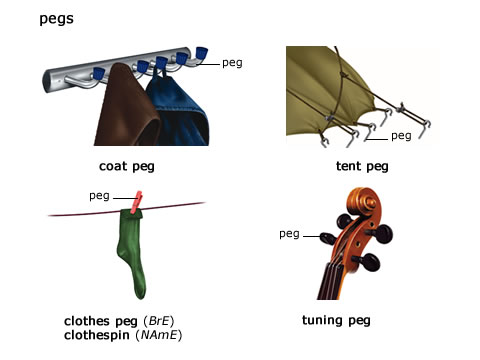 peg [peg pegs pegged pegging] noun, verb BrE [peɡ] NAmE [peɡ] noun  1. a short piece of wood, metal or plastic used for holding things together, hanging things on, marking a position, etc •There's a peg near the door to hang your coat on. •Mark the boundary with pegs. 2. (also ˈtent peg)a small pointed piece of wood or metal that you attach to the ropes of a tent and push into the ground in order to hold the tent in place 3. (also ˈclothes peg) (both BrE) (NAmE clothes·pin)a piece of wood or plastic used for attaching wet clothes to a clothes line 4. (also ˈtuning peg)a wooden, metal or plastic screw used for making the strings of a musical instrument tighter or looser more at a square peg (in a round hole) at ↑square adj. Word Origin: late Middle English: probably of Low German origin; compare with Dutch dialect peg ‘plug, peg’. The verb dates from the mid 16th cent. Example Bank: •The score is kept by inserting pegs into a board. Idioms: ↑off the peg ▪ ↑peg to hang something on ▪ ↑take somebody down a peg Derived: ↑peg away ▪ ↑peg out ▪ ↑peg somebody back verb (-gg-) 1. to fasten sth with ↑pegs •~ sth (out) + adv./prep. All their wet clothes were pegged out on the line. •~ sth to sth She was busy pegging her tent to the ground. 2. usually passive to fix or keep prices, wages, etc. at a particular level •~ sth (at sth) Pay increases will be pegged at 5%. •~ sth (to sth) Loan repayments are pegged to your income. •to peg the exchange rate to the dollar •Admission prices have been pegged. 3. ~ sb as sth (NAmE, informal)to think of sb in a particular way •She pegged him as a big spender. see be level pegging at ↑level adj. Verb forms: Word Origin: late Middle English: probably of Low German origin; compare with Dutch dialect peg ‘plug, peg’. The verb dates from the mid 16th cent. See also: ↑clothes peg ▪ ↑clothespin ▪ ↑off the rack ▪ ↑tent peg ▪ ↑tuning peg