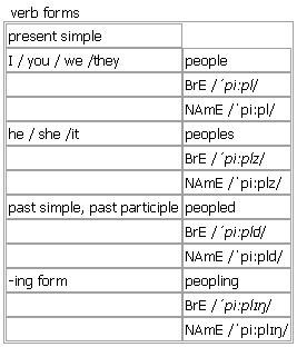 people [people peoples peopled peopling] noun, verb BrE [ˈpiːpl] NAmE [ˈpiːpl] noun 1. plural persons; men, women and children • At least ten people were killed in the crash. • There were a lot of people at the party. •Many young people are out of work. 2. plural persons in general or everyone • He doesn't care what people think of him. • She tends to annoy people. Use everyone or everybody instead of ‘all people’. 3. countable all the persons who live in a particular place or belong to a particular country, race, etc •the French people •the native peoples of Siberia see also ↑townspeople 4. the peopleplural the ordinary men and women of a country rather than those who govern or have a special position in society •the life of the common people • It was felt that the government was no longer in touch with the people. see also ↑little people 5. plural men and women who work in a particular type of job or are involved in a particular area of activity •a meeting with business people and bankers • These garments are intended for professional sports people. 6. plural (literary)the men, women and children that a person leads • The king urged his people to prepare for war. •the story of the Zulu leader who died while attempting to free his people 7. plural the men and women who work for you or support you •I've had my people watching the house for a few days. •Our people are all highly trained and motivated. 8. plural (BrE, informal)guests or friends •I'm having people to dinner this evening. 9. plural (old-fashioned)the men, women and children that you are closely related to, especially your parents, grandparents, etc •She's spending the holidays with her people. see also ↑boat people, ↑street people, ↑tradespeople more at a man of the people at ↑man n., be all things to all men/people at ↑thing Word Origin: Middle English: from Anglo-Norman French poeple, from Latin populus ‘populace’. Thesaurus: people noun 1. pl. •She doesn't care what people think of her. informal folk • |especially AmE, informal folks • young/elderly/old/rich/poor/black/white people/folk common/ordinary/working/working-class/everyday people/folk city/country/local people/folk 2. C •We campaign for the rights of tribal peoples. race • • nationality • • ethnic group • • clan • |sometimes offensive tribe • between peoples/races/nationalities/ethnic groups/clans/tribes different/other peoples/races/nationalities/ethnic groups/clans/tribes Example Bank: •Australia is a collectivity of diverse peoples. •I was elected to represent the people of Bristol. •Many innocent people were killed. •The EU was intended to unite the peoples of Europe. •The local tourist board is trying to attract more people to the town. •These artists derived much of their imagery from the art of so-called primitive peoples. •a line of limousines carrying very important people •access for disabled people •the culture of the Basque people •the customs of primitive peoples of the Amazon Basin •He doesn't care what people think of him. •He researched the customs of the primitive peoples of the Amazon Basin. •The book contains translations of folk poetry of the Slav peoples. •The caribou have traditionally been hunted by indigenous peoples in the area. •The organization campaigns for the rights of tribal peoples. •The rest of China's Muslim minorities are mostly Turkic peoples. •We should strive for peace among the peoples of the world. •Working-class people in general get a bad deal from the legal system. Idioms: ↑of all people ▪ ↑people in glass houses shouldn't throw stones verb usually passive ~ sth (with sth) to live in a place or fill it with people • The town was peopled largely by workers from the car factory and their families. • The ballroom was peopled with guests. Verb forms: Word Origin: Middle English: from Anglo-Norman French poeple, from Latin populus ‘populace’. Example Bank: •Her novels are peopled with interesting, complex characters.