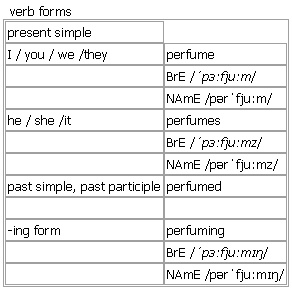 per·fume [perfume perfumes perfumed perfuming] noun, verb BrE [ˈpɜːfjuːm] NAmE [pərˈfjuːm] noun countable, uncountable 1. a liquid, often made from flowers, that you put on your skin to make yourself smell nice •a bottle of expensive perfume •We stock a wide range of perfumes. •the perfume counter of the store •She was wearing too much perfume. •There was strong smell of cheap perfume in the car. 2. a pleasant, often sweet, smell Syn: ↑scent •the heady perfume of the roses Word Origin: mid 16th cent. (originally denoting pleasant-smelling smoke from a burning substance, especially one used in fumigation): from French parfum (noun), parfumer (verb), from obsolete Italian parfumare, literally ‘to smoke through’. Example Bank: •He caught a faint whiff of her expensive perfume. •She dabbed some perfume on her wrists. •She reeked of cheap perfume. •She works on the perfume counter. •The letter had been sprayed with perfume. •The lilies release their heady perfume in the evening. •The perfume of the roses filled the room. •You could smell the perfume of the lilies. •The perfume of orange blossom filled the air. •The roses gave off a heady perfume. Derived Word: ↑perfumed verb often passive 1. ~ sth (with sth) (literary) (especially of flowers)to make the air in a place smell pleasant Syn: ↑scent •The garden was perfumed with the smell of roses. •One bloom has the power to perfume a whole room. 2. ~ sth (with sth) to put ↑perfume in or on sth •She perfumed her bath with fragrant oils. Verb forms: Word Origin: mid 16th cent. (originally denoting pleasant-smelling smoke from a burning substance, especially one used in fumigation): from French parfum (noun), parfumer (verb), from obsolete Italian parfumare, literally ‘to smoke through’.