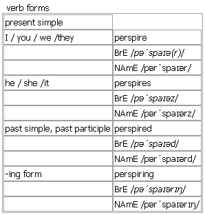 per·spire [perspire perspires perspired perspiring] BrE [pəˈspaɪə(r)] NAmE [pərˈspaɪər] verb intransitive (formal) to produce sweat on your body Syn: ↑sweat •The game of squash left me perspiring profusely. •He mopped his perspiring face with a handkerchief. Verb forms: Word Origin: mid 17th cent.: from French perspirer, from Latin perspirare, from per- ‘through’ + spirare ‘breathe’. Example Bank: •She was perspiring a little with the heat.