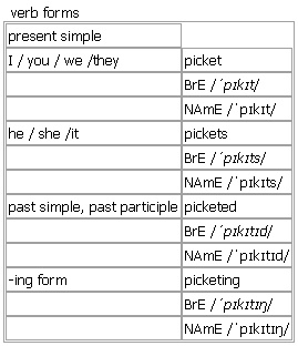 picket [picket pickets picketed picketing] noun, verb BrE [ˈpɪkɪt] NAmE [ˈpɪkɪt] noun 1. a person or group of people who stand outside the entrance to a building in order to protest about sth, especially in order to stop people from entering a factory, etc. during a strike; an occasion at which this happens •Five pickets were arrested by police. •I was on picket duty at the time. •a mass picket of the factory see also ↑flying picket, ↑picketer 2. a soldier or group of soldiers guarding a military base 3. a pointed piece of wood that is fixed in the ground, especially as part of a fence •a picket fence Word Origin: late 17th cent. (denoting a pointed stake, on which a soldier was required to stand on one foot as a military punishment): from French piquet ‘pointed stake’, from piquer ‘to prick’, from pic ‘pike’. Example Bank: •Flying pickets arrived from all over the country. •They organized a mass picket of the governor's palace. •angry people with picket signs verb transitive, intransitive ~ (sth) to stand outside somewhere such as your place of work to protest about sth or to try and persuade people to join a strike •200 workers were picketing the factory. •Striking workers picketed outside the gates. Verb forms: Word Origin: late 17th cent. (denoting a pointed stake, on which a soldier was required to stand on one foot as a military punishment): from French piquet ‘pointed stake’, from piquer ‘to prick’, from pic ‘pike’.