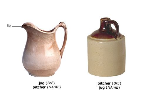 pitch·er [pitcher pitchers] BrE [ˈpɪtʃə(r)] NAmE [ˈpɪtʃər] noun  1. (NAmE) (BrE jug)a container with a handle and a ↑lip, for holding and pouring liquids •a pitcher of water 2. (BrE)a large ↑clay container with a small opening and one or two handles, used, especially in the past, for holding liquids 3. (in ↑baseball)the player who throws the ball to the ↑batter See also: ↑jug Word Origin: senses 1 to 2 Middle English: from Old French pichier ‘pot’, based on late Latin picarium. Example Bank: •Left-handed hitters usually prefer facing right-handed pitchers. •The pitcher threw a hard fastball. •the Houston Astros' star pitcher •Pour the ingredients into a pitcher, add ice and stir.