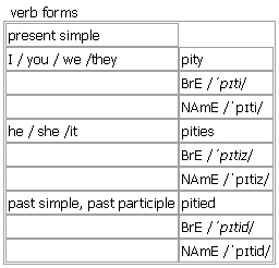 pity [pity pities pitied pitying] noun, verb BrE [ˈpɪti] NAmE [ˈpɪti] noun 1. uncountable ~ (for sb/sth) a feeling of sympathy and sadness caused by the suffering and troubles of others • I could only feel pity for what they were enduring. • He had no pity for her. •a look/feeling/surge of pity •I took pity on her and lent her the money. • (formal)I beg you to have pity on him. •I don't want your pity. 2. singular used to show that you are disappointed about sth Syn: ↑shame •a ~ (that…) It's a pity that you can't stay longer. • ‘I've lost it!’ ‘Oh, what a pity.’ •What a pity that she didn't tell me earlier. •a ~ (to do sth) It seems a pity to waste this food. •This dress is really nice. Pity it's so expensive. •Oh, that's a pity. •It would be a great pity if you gave up now. Word Origin: Middle English (also in the sense ‘clemency, mildness’): from Old French pite ‘compassion’, from Latin pietas ‘piety’; compare with ↑piety. Thesaurus: pity noun 1. U •She was full of pity for the unfortunate young man. compassion • • sympathy • pity/compassion/sympathy for sb/sth feel/be full of pity/compassion/sympathy have pity/compassion/sympathy (for sb/sth) Pity or compassion? Compassion is a warm, kind feeling that suggests that you understand what sb is suffering. If you feel pity you do not necessarily have this understanding. 2. a pity sing. (especially spoken) •It's a pity that you can't stay longer. unfortunate • |especially spoken a shame • • too bad • |formal regrettable • It's a pity/a shame/too bad about sb/sth. a pity/unfortunate/a shame/too bad/regrettable that… a great/real/terrible pity/shame What a pity/shame! Word Family: pity noun verb pitiful adjective pitiless adjective pitiable adjective piteous adjective Example Bank: •I threw the child some money out of pity. •I took pity on him and allowed him to stay. •She was full of pity for him. •That would be rather a pity, wouldn't it? •The place was great, but it was a pity about the weather. •We begged him to have pity on us. •What a pity you didn't tell me earlier! •a cruel leader without pity •an unfortunate man who inspires pity •‘I've lost it!‘ ‘Oh, what a pity.’ •‘Was the bicycle insured?’ ‘No, more's the pity!’ •I don't want your pity! •It's a pity that you can't stay longer. •Oh, that's a pity. •She experienced a sudden feeling of pity for the young man. •This dress is really nice. Pity it's so expensive. Idiom: ↑more's the pity verb (pit·ies, pit·ied, pit·ied)(not used in the progressive tenses) to feel sorry for sb because of their situation; to feel pity for sb •~ sb He pitied people who were stuck in dead-end jobs. • Compulsive gamblers are more to be pitied than condemned. •~ sb doing sth I pity her having to work such long hours. Verb forms: Word Origin: Middle English (also in the sense ‘clemency, mildness’): from Old French pite ‘compassion’, from Latin pietas ‘piety’; compare with ↑piety. Word Family: pity noun verb pitiful adjective pitiless adjective pitiable adjective piteous adjective