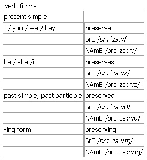 pre·serve [preserve preserves preserved preserving] verb, noun BrE [prɪˈzɜːv] NAmE [prɪˈzɜːrv] verb 1. ~ sth to keep a particular quality, feature, etc; to make sure that sth is kept • He was anxious to preserve his reputation. • Efforts to preserve the peace have failed. •She managed to preserve her sense of humour under very trying circumstances. 2. often passive to keep sth in its original state in good condition •~ sth/sb a perfectly preserved 14th century house • (humorous) Is he really 60? He's remarkably well preserved. •~ sth + adj. This vase has been preserved intact. 3. ~ sth to prevent sth, especially food, from decaying by treating it in a particular way •olives preserved in brine • Wax polish preserves wood and leather. 4. ~ sb/sth (from sth) to keep sb/sth alive, or safe from harm or danger Syn: ↑save • The society was set up to preserve endangered species from extinction. compare ↑conserve Verb forms: Word Origin: late Middle English (in the sense ‘keep safe from harm’): from Old French preserver, from late Latin praeservare, from prae- ‘before, in advance’ + servare ‘to keep’. Thesaurus: preserve verb 1. T •We are naturally anxious to preserve our reputation. maintain • • keep sth up • • sustain • • extend • • prolong • |especially spoken keep sth going • |formal perpetuate • |often disapproving, especially business prop sth up • preserve/maintain/keep up/sustain standards/a relationship preserve/maintain/sustain/extend/prolong (sb's) life preserve/maintain/keep up a tradition 2. T, often passive •a perfectly preserved stretch of Roman road maintain • • keep sth up • preserve/maintain a house have/keep sth preserved/maintained well/fully preserved/maintained 3. T •They try to preserve endangered species from extinction. protect • • save • • defend • • guard • • shield • • shelter • • rescue • • secure • |formal safeguard • preserve/protect/save/defend/guard/shield/shelter/rescue/secure/safeguard sb/sth from sth preserve/protect/save/safeguard jobs preserve/protect/save a species Example Bank: •She carefully preserved all his letters. •The Act contained provisions designed to preserve the status quo. •The bones had all been preserved intact. •The collection has been sold to the British Museum where it will be preserved for the nation. •The iron coins are poorly preserved and have rusted. •The prison is preserved as a tourist attraction. •The style of the original film is preserved perfectly. •They were thrilled to discover a beautifully preserved specimen of Roman pottery. •We need to take action to help preserve fish stocks. •We were anxious to preserve the original character of the house. •You need to say why the building is worth preserving. •an attempt to preserve the corpse from decomposition •campaigners fighting to preserve a historic building •taking action to help preserve fish stocks •Is he really 60? He's remarkably well preserved. •She wanted to preserve him from harassment. •She was determined to preserve her independence and way of life. •The National Trust preserves the house and its grounds. •Three miles away is a perfectly preserved stretch of Roman road. •To preserve life should always be the goal. noun 1. singular ~ (of sb) an activity, a job, an interest, etc. that is thought to be suitable for one particular person or group of people • Football is no longer the preserve of men. •in the days when nursing was a female preserve 2. countable, usually plural, uncountable a type of jam made by boiling fruit with a large amount of sugar 3. countable, usually plural, uncountable (especially BrE)a type of ↑pickle made by cooking vegetables with salt or ↑vinegar 4. countable (NAmE) = ↑reserve (2) 5. countable an area of private land or water where animals and fish are kept for people to hunt Word Origin: late Middle English (in the sense ‘keep safe from harm’): from Old French preserver, from late Latin praeservare, from prae- ‘before, in advance’ + servare ‘to keep’. Example Bank: •This land is protected as a wildlife preserve. •Higher education is no longer the preserve of the wealthy. •I began my career in the days when nursing was a female preserve. •Sth is the preserve of philosophers/a leisured upper class/a few academics/a social elite/affluent owner occupiers/Oxford dons/scholars.