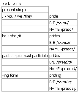 pride [pride prides prided priding] noun, verb BrE [praɪd] NAmE [praɪd] noun PLEASURE/SATISFACTION 1. uncountable, singular a feeling of pleasure or satisfaction that you get when you or people who are connected with you have done sth well or own sth that other people admire • The sight of her son graduating filled her with pride. • He felt a glow of pride as people stopped to admire his garden. •~ (in sth) I take (a) pride in my work. •~ (in doing sth) We take great pride in offering the best service in town. •I looked with pride at what I had achieved. •Success in sport is a source of national pride. 2. singular the ~ of sth a person or thing that gives people a feeling of pleasure or satisfaction •The new sports stadium is the pride of the town. RESPECT FOR YOURSELF 3. uncountable the feeling of respect that you have for yourself • Pride would not allow him to accept the money. • Her pride was hurt. •Losing his job was a real blow to his pride. •It's time to swallow your pride (= hide your feelings of pride) and ask for your job back. 4. uncountable (disapproving)the feeling that you are better or more important than other people • Male pride forced him to suffer in silence. see also ↑proud LIONS 5. countable + singular or plural verb a group of ↑lions Word Origin: late Old English prȳde ‘excessive self-esteem’, variant of prȳtu, prȳte, from prūd ‘having a high opinion of one's own worth’, from Old French prud ‘valiant’, based on Latin prodesse ‘be of value’. Thesaurus: pride noun 1. U, sing. •We take great pride in our nation's success in sport. satisfaction • • happiness • • contentment • |BrE fulfilment • |AmE fulfillment • Opp: shame pride/satisfaction/happiness/contentment/fulfilment in sth bring sb pride/satisfaction/happiness/contentment/fulfilment take pride/satisfaction in sth 2. U •I'm sorry if I hurt your pride. dignity • • self-esteem • • self-respect • • feelings • |sometimes disapproving ego • injured/personal pride/dignity/self-esteem/feelings hurt sb's pride/feelings restore sb's pride/dignity/self-esteem/self-respect 3. U (disapproving) •Male pride forced him to suffer in silence. egoism • • vanity • • arrogance • |especially written conceit • |literary hubris • Opp: humility, Opp: modesty appeal to sb's pride/vanity Synonyms: satisfaction happiness • pride • contentment • fulfilment These are all words for the good feeling that you have when you are happy or when you have achieved sth. satisfaction • the good feeling that you have when you have achieved sth or when sth that you wanted to happen does happen: ▪ He derived great satisfaction from knowing that his son was happy. happiness • the good feeling that you have when you are happy: ▪ Money can't buy you happiness. pride • a feeling of pleasure or satisfaction that you get when you or people who are connected with you have done sth well or own sth that other people admire: ▪ The sight of her son graduating filled her with pride. contentment • (rather formal) a feeling of happiness or satisfaction with what you have: ▪ They found contentment in living a simple life. fulfilment • a feeling of happiness or satisfaction with what you do or have done: ▪ her search for personal fulfilment satisfaction, happiness, contentment or fulfilment? You can feel satisfaction at achieving almost anything, small or large; you feel fulfilment when you do sth useful and enjoyable with your life. Happiness is the feeling you have when things give you pleasure and can be quite a lively feeling; contentment is a quieter feeling that you get when you have learned to find pleasure in things. satisfaction/happiness/pride/contentment/fulfilment in sth real satisfaction/happiness/pride/contentment/fulfilment true satisfaction/happiness/contentment/fulfilment great satisfaction/happiness/pride quiet satisfaction/pride/contentment to feel satisfaction/happiness/pride/contentment to bring sb satisfaction/happiness/pride/contentment/fulfilment to find satisfaction/happiness/contentment/fulfilment Example Bank: •Businesses rushed to include images of patriotic pride in their marketing. •He smiled with fatherly pride. •He swelled with pride as he held the trophy. •He was nursing his hurt pride. •His masculine pride would not let him admit that a girl had defeated him. •I didn't mean to hurt your pride. •I don't want your money— I have my pride, you know! •I wear my policeman's uniform with pride. •It is a matter of pride for him that he has never accepted money from his family. •It was foolish pride that prevented me from believing her. •It would be stupid to refuse through pride. •She expressed pride in her child's achievement. •She refused his offer tactfully, allowing him to go away with his pride intact. •She refused their help out of pride. •She swallowed her pride and called him. •She takes great pride in her work. •She took justifiable pride in her son's achievements. •Their reputation for fairness is a matter for pride. •They have a fierce pride in their traditions. •They have a strong sense of pride in their work. •They managed to salvage some pride with a late goal. •We want to restore pride in our public services. •the politics of racial pride and Black Power •He loves that boat, it's his pride and joy. •His pride would not allow him to admit she was right. •I take (a) pride in my work. •I'm sorry if I hurt your pride. •It's time to swallow your pride and ask for help. •She was conceited, haughty and full of pride and arrogance. •What's wrong— did I hurt your macho pride? •You're going to have to swallow your pride and ask for your job back. Idioms: ↑pride goes before a fall ▪ ↑pride of place ▪ ↑somebody's pride and joy Derived: ↑pride yourself on on doing something verb Verb forms: Word Origin: late Old English prȳde ‘excessive sel