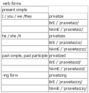 pri·vat·ize (BrE also-ise) [privatize privatizes privatized privatizing] BrE [ˈpraɪvətaɪz] NAmE [ˈpraɪvətaɪz] verb ~ sth to sell a business or an industry so that it is no longer owned by the government Syn: ↑denationalize •Air traffic control has been privatized. Opp: ↑nationalize Derived Word: ↑privatization Verb forms: