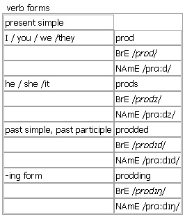 prod [prod prods prodded prodding] verb, noun BrE [prɒd] NAmE [prɑːd] verb (-dd-) 1. transitive, intransitive to push sb/sth with your finger or with a pointed object Syn: ↑poke •~ sb/sth (+ adv./prep.) She prodded him in the ribs to wake him up. •~ at sb/sth He prodded at his breakfast with a fork. 2. transitive ~ sb (into sth/into doing sth) to try to make sb do sth, especially when they are unwilling •She finally prodded him into action. Verb forms: Word Origin: mid 16th cent. (as a verb): perhaps symbolic of a short poking movement, or a blend of ↑poke and dialect brod ‘to goad, prod’. The noun dates from the mid 18th cent. Example Bank: •‘You still haven't answered my question,‘ she prodded him. •Dan prodded at his breakfast with a fork. •He kept very quiet until she prodded him to say what he was looking for. •Institutions were prodded into changing over to commercial management structures. •Martha prodded him awake. •She prodded the dry ground with a stick. •Someone was prodding me in the ribs. noun 1. the act of pushing sb with your finger or with a pointed object Syn: ↑dig •She gave him a sharp prod with her umbrella. 2. (informal)an act of encouraging sb or of reminding sb to do sth •If they haven't replied by next week, you'll have to call them and give them a prod. 3. an instrument like a stick that is used for ↑prodding animals 4. Prod (also Prod·die BrE [ˈprɒdi] ; NAmE [ˈprɑːdi] ) (informal)an offensive word for a Protestant Word Origin: mid 16th cent. (as a verb): perhaps symbolic of a short poking movement, or a blend of ↑poke and dialect brod ‘to goad, prod’. The noun dates from the mid 18th cent. Example Bank: •She gave the pile of clothes another prod.