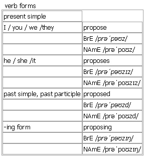 pro·pose [propose proposes proposed proposing] BrE [prəˈpəʊz] NAmE [prəˈpoʊz] verb SUGGEST PLAN 1. transitive (formal)to suggest a plan, an idea, etc. for people to think about and decide on •~ sth The government proposed changes to the voting system. • What would you propose? •~ that… She proposed that the book be banned. • (BrE also)She proposed that the book should be banned. •it is proposed that… It was proposed that the president be elected for a period of two years. •~ doing sth He proposed changing the name of the company. •it is proposed to do sth It was proposed to pay the money from public funds. INTEND 2. transitive (formal)to intend to do sth •~ to do sth What do you propose to do now? •~ doing sth How do you propose getting home? MARRIAGE 3. intransitive, transitive to ask sb to marry you • He was afraid that if he proposed she might refuse. •~ to sb She proposed to me! •~ sth (to sb) to propose marriage AT FORMAL MEETING 4. transitive to suggest sth at a formal meeting and ask people to vote on it •~ sb (for/as sth) I propose Tom Ellis for chairman. •~ sth to propose a motion (= to be the main speaker in support of an idea at a formal debate) compare ↑oppose, ↑second SUGGEST EXPLANATION 5. transitive ~ sth (formal)to suggest an explanation of sth for people to consider Syn: ↑propound •She proposed a possible solution to the mystery. Idioms: ↑propose a toast ▪ ↑propose somebody's health Verb forms: Word Origin: Middle English: from Old French proposer, from Latin proponere ‘set forth’ (from pro- ‘forward’ + ponere ‘put’), but influenced by Latin propositus ‘put or set forth’ and Old French poser ‘to place’. Thesaurus: propose verb 1. T •He proposed a solution to the problem. suggest • • put sth forward • • recommend • • present • |formal move • • advance • • moot • propose/suggest/be put forward/recommend/move/be mooted that… propose/suggest/put forward/recommend/present/move/moot an idea propose/suggest/put forward/present an alternative propose/suggest/put forward a/an change/measure Propose, suggest or put forward? Propose and put forward are used in more formal situations than suggest. 2. I (formal) •What do you propose to do? intend • • plan • • aim • • have sb/sth in mind • |especially spoken mean • propose/intend/plan/aim/have in mind/mean to do sth propose/intend doing sth Example Bank: •Are you seriously proposing that we should allow this situation to continue? •He was proposed for the job of treasurer. •The measures have been proposed as a way of improving standards. •The plan originally proposed was ruled completely unrealistic. •the newly proposed amendments •the recently proposed standards •He will propose a motion in tomorrow's debate. •She proposed a reduction in the state president's powers. •The proposed trip to Spain had to be cancelled at the last minute. •We do not propose to take any further action in the matter.