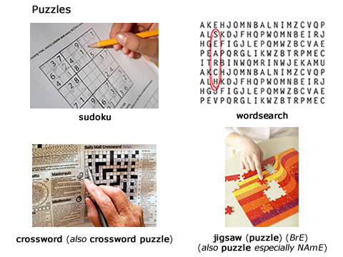 puz·zle [puzzle puzzles puzzled puzzling] noun, verb BrE [ˈpʌzl] NAmE [ˈpʌzl] noun  1. a game, etc. that you have to think about carefully in order to answer it or do it •a crossword puzzle •a book of puzzles for children 2. (especially NAmE) = ↑jigsaw 3. usually singular something that is difficult to understand or explain Syn: ↑mystery •The deeper meaning of the poem remains a puzzle. •The detectives were beginning to solve the murder. All the pieces in the puzzle were falling neatly into place. Word Origin: late 16th cent. (as a verb): of unknown origin. Culture: crosswords Crosswords, or crossword puzzles, first appeared in the US in the early 20th century. Today, many people in the US and in Britain regularly do crosswords, sometimes on the bus or train on their way to work. Most newspapers and magazines contain at least one crossword and there are often prizes for people who send in the correct solution. Books of crosswords are also popular. Solving a crossword involves answering a set of clues. The answers are words or phrases which fit together in a patterned grid. The clues are usually numbered and listed as across and down, according to whether the answer reads across the grid or from top to bottom. There are two basic types of crossword, called in Britain quick crosswords and cryptic crosswords. In quick crosswords the clues are usually definitions of the answers. This is much the most common type of crossword in the US, where the grids are usually a lot bigger and contain many more words. These crosswords are not necessarily easy, and the one in the Sunday issue of the ↑New York Times is considered very difficult. Cryptic crosswords, which began in Britain and are much more popular there than in any other country, have clues which contain both a definition of the answer and a word puzzle involving the letters in it. One common type of word puzzle is an anagram, in which the letters of the answer word are rearranged in the clue to form another word or phrase. For example, CARTHORSE and SHORT RACE are both anagrams of the word ORCHESTRA. Example Bank: •The origin of the word is something of a puzzle. •The police didn't know what the message meant, but it was another piece in the puzzle. •The puzzle remains of what happened to the ship. •There is a puzzle about how the plant first came to Britain. •They knew who the killer was, but there were still some gaps in the puzzle. •They're trying to solve the puzzle of how gravity works. •Traces of explosives found among the wreckage were the key to the puzzle. Derived Word: ↑puzzling Derived: ↑puzzle over something ▪ ↑puzzle something out verb ~ sb to make sb feel confused because they do not understand sth Syn: ↑baffle •What puzzles me is why he left the country without telling anyone. Verb forms: Word Origin: late 16th cent. (as a verb): of unknown origin. Example Bank: •I had noticed something puzzling. •Marlowe was a puzzling character. •There were reports of the puzzling deaths of hundreds of dolphins. Example Bank: •This is something that has always puzzled me greatly. •How they recognized you is what puzzles me. •It has always puzzled me that he hasn't won more tournaments. •This question has puzzled scientists for decades. •What puzzles me is why he left without telling anyone.