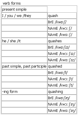 quash [quash quashes quashed quashing] BrE [kwɒʃ] NAmE [kwɔːʃ] NAmE [kwɑːʃ] verb 1. ~ sth (BrE, law)to officially say that a decision made by a court is no longer valid or correct Syn: ↑overturn •His conviction was later quashed by the Court of Appeal. 2. ~ sth to take action to stop sth from continuing Syn: ↑suppress •The rumours were quickly quashed. Verb forms: Word Origin: Middle English: from Old French quasser ‘annul’, from late Latin cassare (medieval Latin also quassare), from cassus ‘null, void’. Compare with ↑squash (verb). Example Bank: •The government moved quickly to quash the revolt.