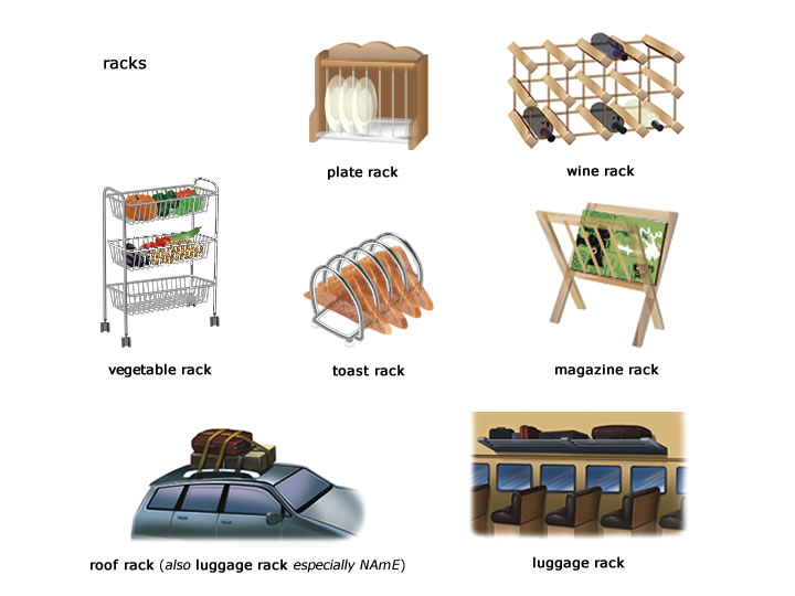 rack [rackracksrackedracking] noun, verb BrE [ræk] NAmE [ræk] noun 1. (often in compounds)a piece of equipment, usually made of metal or wooden bars, that is used for holding things or for hanging things on •a vegetable/wine/plate/toast rack •I looked through a rack of clothes at the back of the shop. •Remove the cakes from the oven and cool on a wire rack. see also ↑luggage rack, ↑roof rack 2. (usually the rack)an instrument of ↑torture, used in the past for punishing and hurting people. Their arms and legs were tied to the wooden frame and then pulled in opposite directions, stretching the body. 3.~ of lamb/pork a particular piece of meat that includes the front ↑ribs and is cooked in the oven 4. a part of a machine that consists of a bar with parts that a wheel or gear can fit into