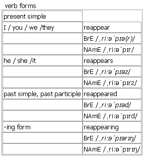 re·appear [reappear reappears reappeared reappearing] BrE [ˌriːəˈpɪə(r)] NAmE [ˌriːəˈpɪr] verb intransitive to appear again after not being heard of or seen for a period of time •She went upstairs and did not reappear until morning. •The moon reappeared from behind a cloud. Derived Word: ↑reappearance Verb forms: